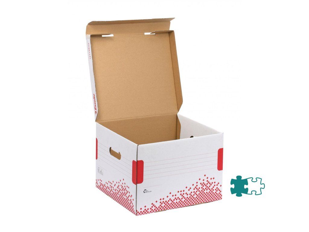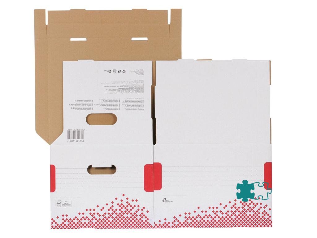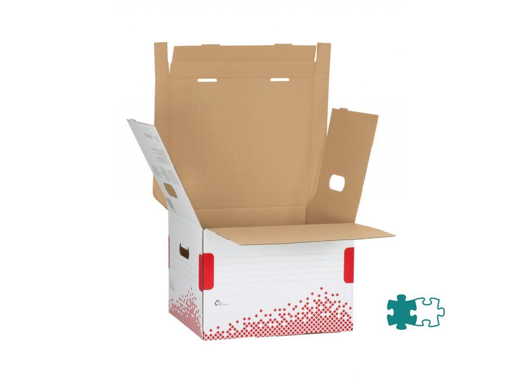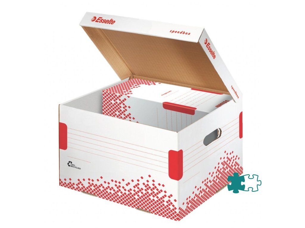 Archívne krabice so sklápacím vekom z archivačného systému Speedbox. Spevnené steny aj dno pre maximálnu pevnosť a odolnosť pri stohovaní. Ideálne na prenos dokumentov alebo rôznych predmetov. Vyrobené zo 100% recyklovanej vlnitej lepenky. Farba biela/ červená. Rozmery 367 × 263 × 325 mm. Kapacita 3 archívne boxy Speedbox 100 mm. Väčšie balenie 15 kusov.Dodatočné parametre