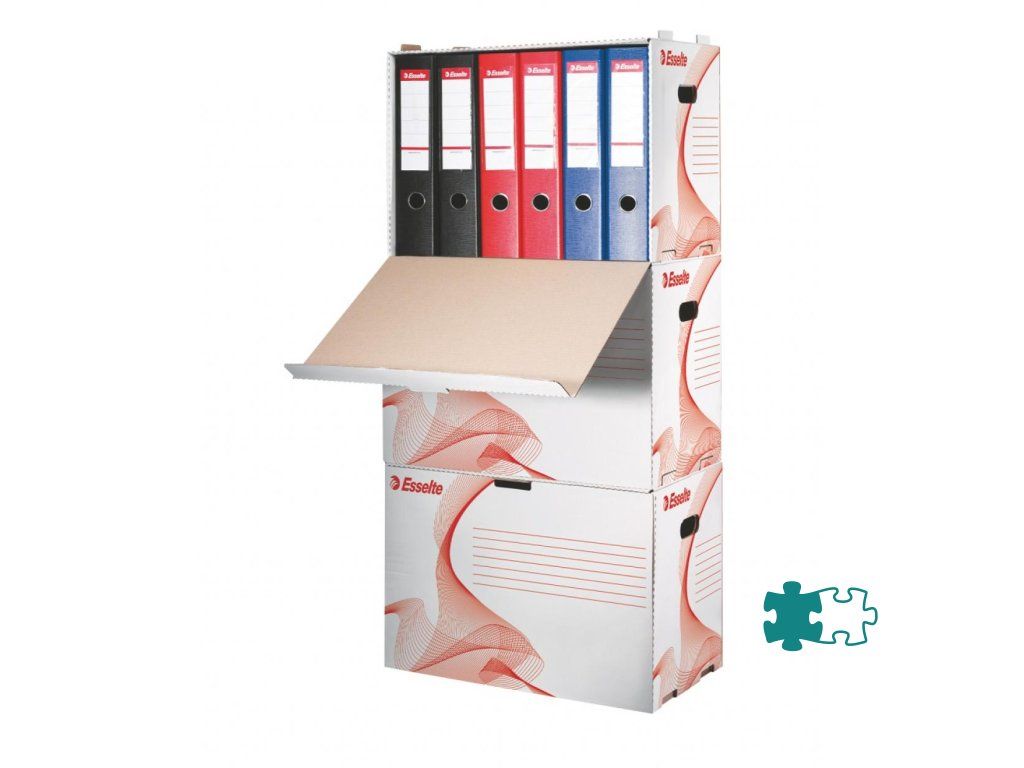 Archívna krabica na prehľadné ukladanie a archiváciu zakladačov. Bočné otvory pre prenášanie, otváranie spredu, predtlač na popis na veku i bokoch. Stabilita pri stohovaní je zaisťovaná vzájomným spojením krabíc pomocou špeciálnych otvorov a úchytov. Kapacita: 10 zakladačov so šírkou chrbta 5 cm, 6 zakladačov so šírkou chrbta 8 cm alebo 6 stojanov na časopisy so šírkou chrbta 8 cm. Väčšie balenie 10 ks.Vonkajšie rozmery (š x v x h): 530 x 343 x 311 mm