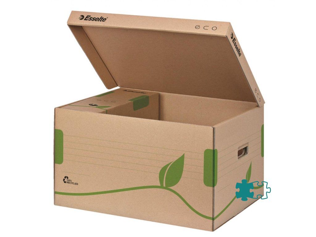 Krabica z archivačného systému Esselte ECO navrhnutá so zeleným prístupom. 100% recyklovateľná s 85% podielom spotrebiteľského odpadu, certifikovaná FSC. Veľkosť optimalizovaná iba na papiere A4 s cieľom minimalizovať odpad pri výrobe.Rozmery (š x v x h): 345 x 242 x 439 mm