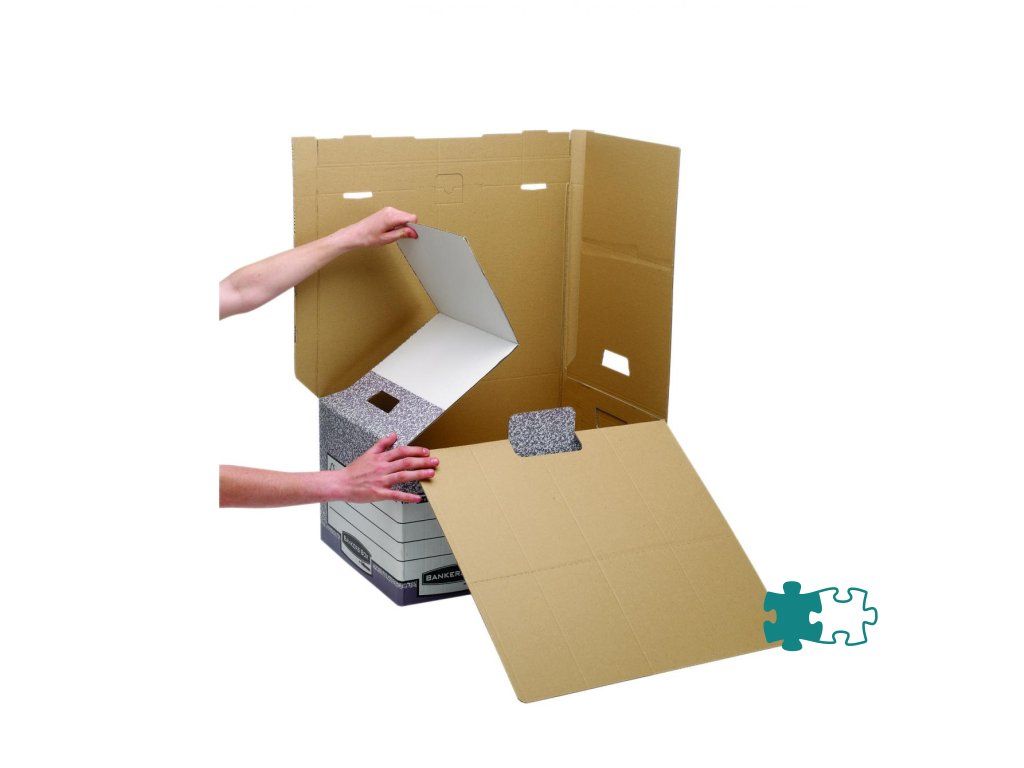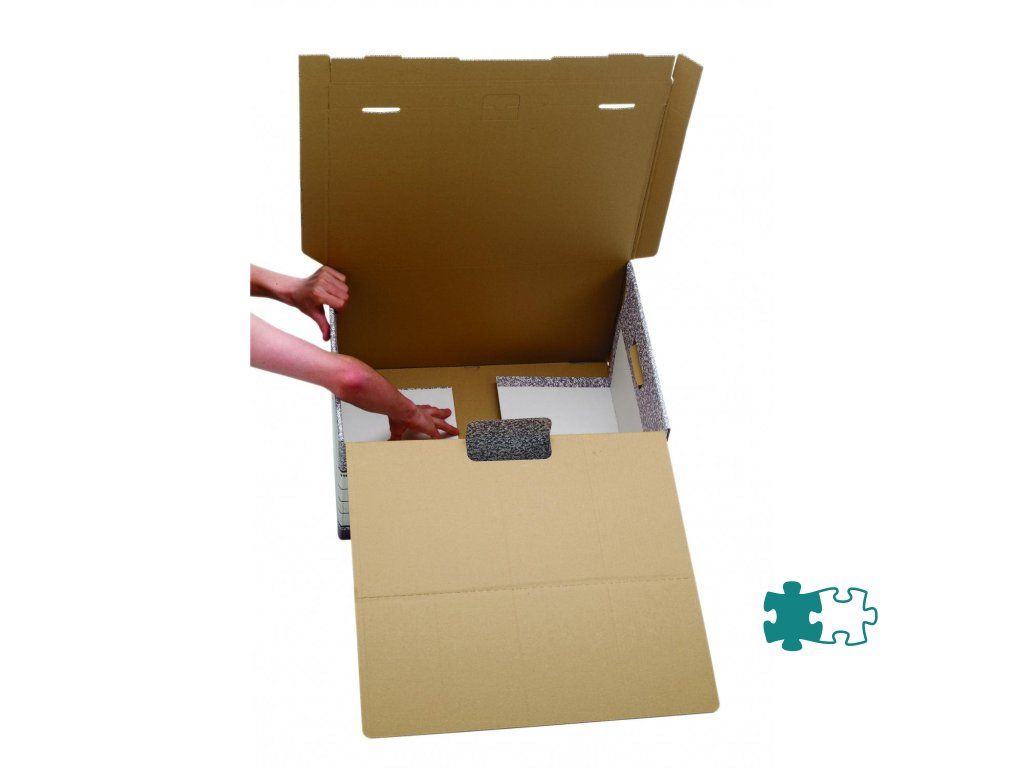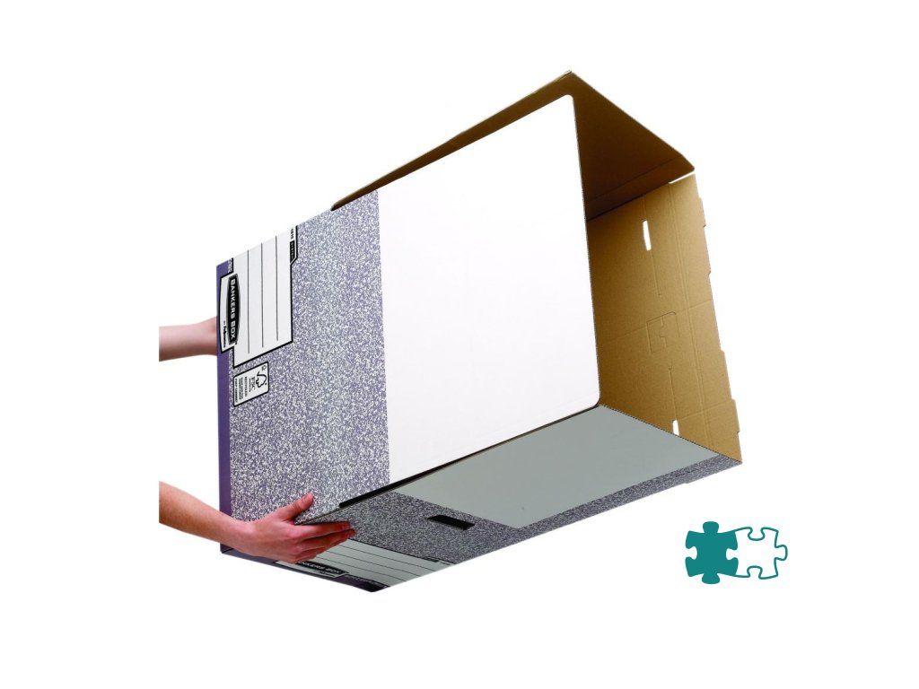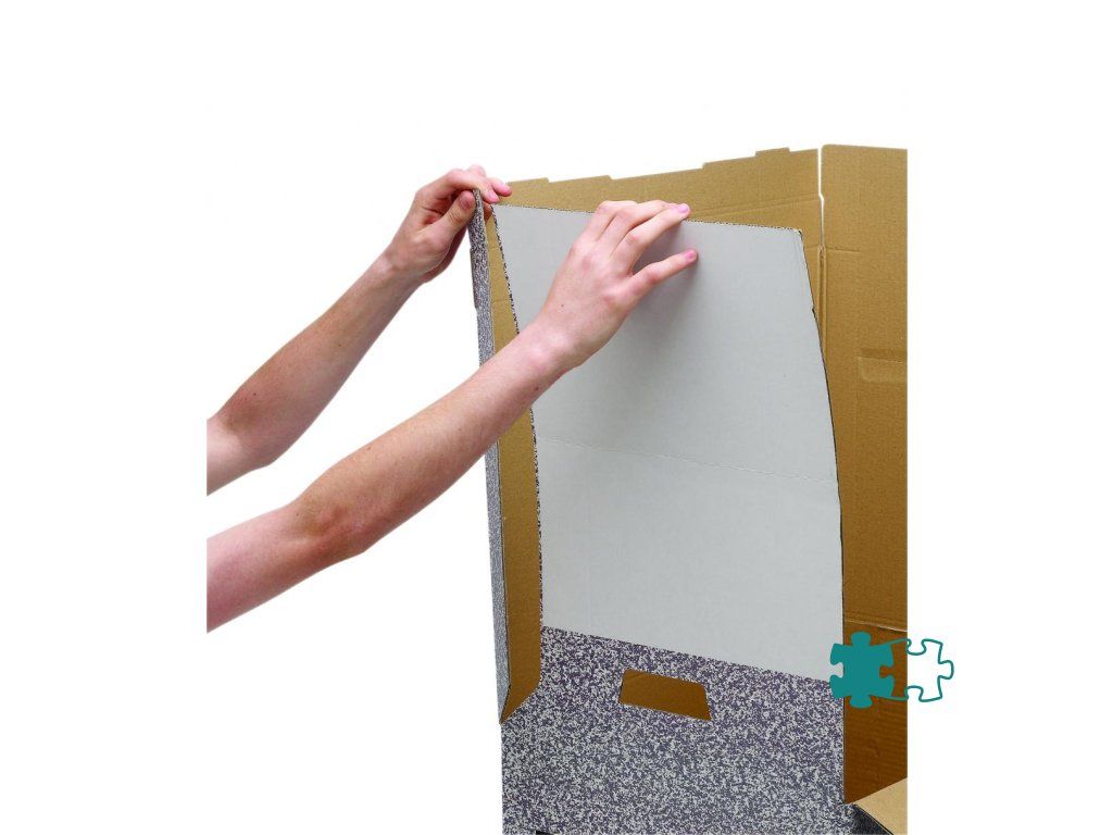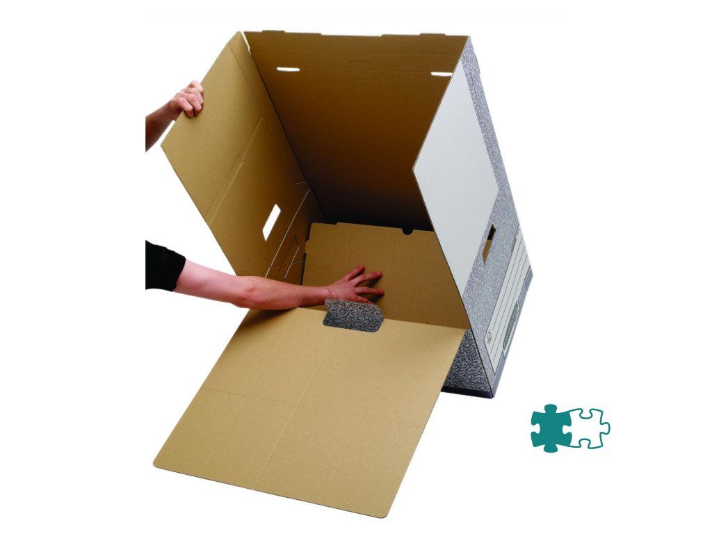 Stabilná krabica s uzatvárateľným sklápacím vekom. Bočné výrezy na uchytenie, steny spevnené zdvojenou vrstvou kartónu. Nosnosť 49,2 kg. Možnosť navyšovania do troch úrovní. Kompatibilná s archívnym boxom. Dodávaná v rozloženom stave naplocho. Väčšie balenie 10 ks. Farba sivá/-biela.Rozmery v cm: 37,8x28x53,5