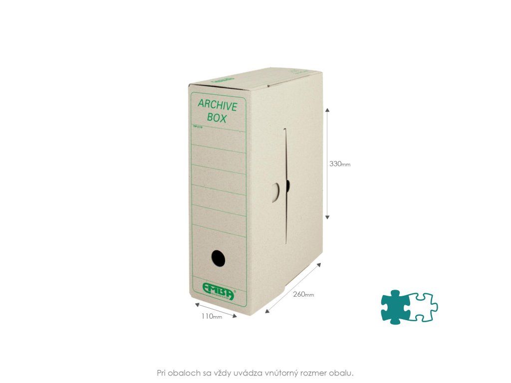 Archívny box z hladkej lepenky na uloženie záznamov do 25 rokov. Používa sa pri rozdelení agendy, účtovných rokov alebo ako firemná farba. Možnosť prehľadného popisu, uloženie v troch polohách. Vhodný v kombinácii so skupinovým boxom - možnosť vložiť 5 boxov I/ 75 alebo kombináciu boxov I/ 50, I/ 75 a I/ 110. Rozmery 110 × 330 × 260 mm. Dodávaný v rozloženom stave. Väčšie balenie 25 ks.Dodatočné parametre