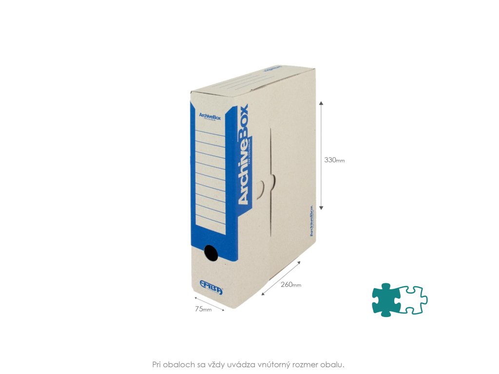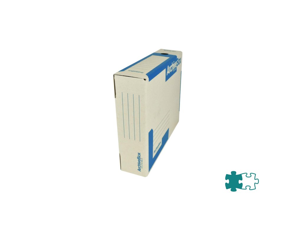 Systém archívnych boxov a škatúľ z vlnitej lepenky. Dodávané v rozloženom stave. Farba prírodná hnedá. Archívny box z hladkej ručnej lepenky, 1 000 g/ m². Konštrukčné riešenie boxu umožňuje rýchly prístup k vloženým dokumentom. Rozmery75 × 330 × 260 mm. Väčšie balenie 25 ks. Farba modrá.
