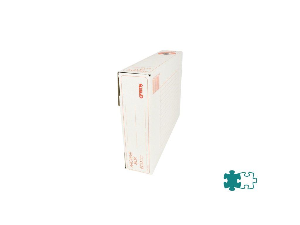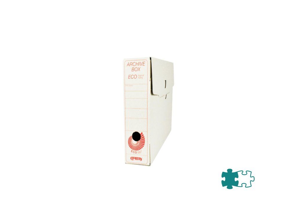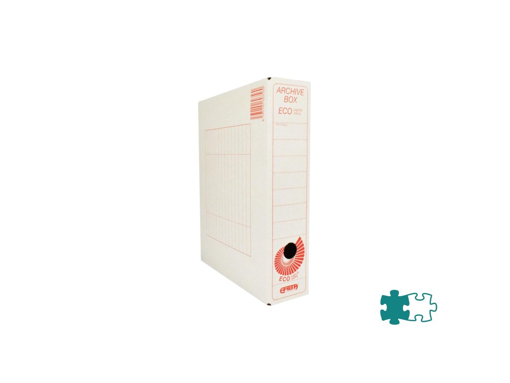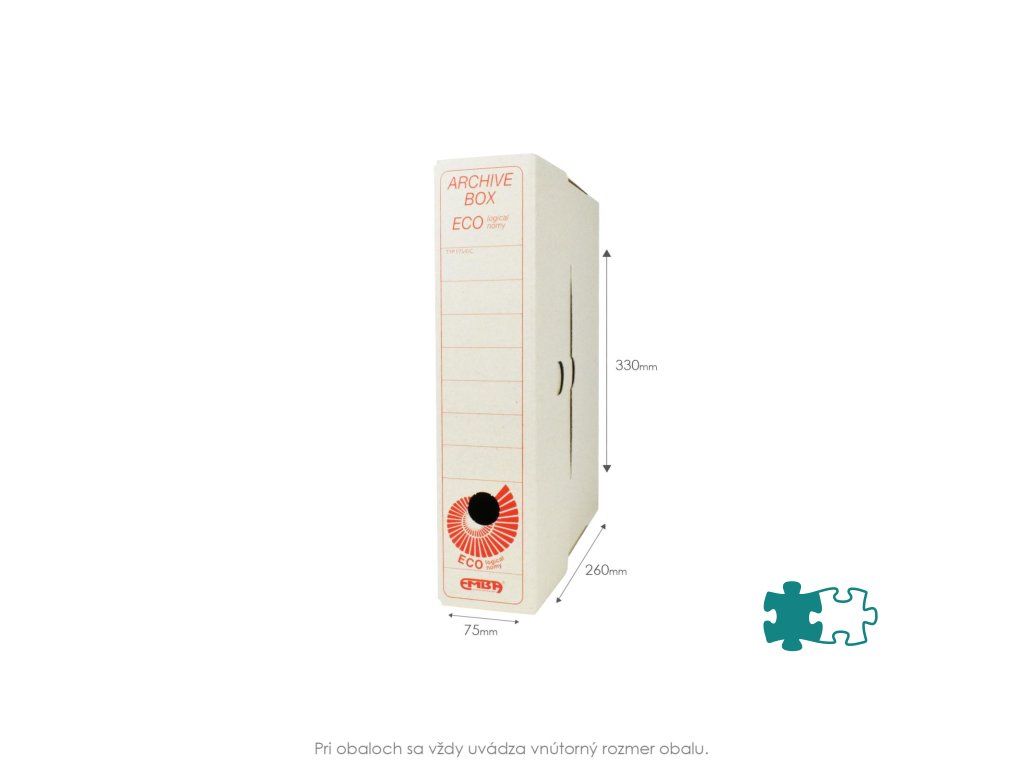 Archívny box ECO A4 sa používa pri rozdelení agendy, účtovných rokov alebo ako firemná farba. Vyrobený z lepenky hrúbky 0,9 mm. Možnosť prehľadného popisu, uloženie v troch polohách. Vhodný v kombinácii so skupinovým boxom - možnosť vložiť 5 boxov I/ 75/ ECO. Ekologicky šetrný výrobok z hladkej ručnej lepenky, 1 000 g/ m². Rozmery 75 × 330 × 260 mm. Dodávaný v rozloženom stave. Väčšie balenie 25 ks.Dodatočné parametre