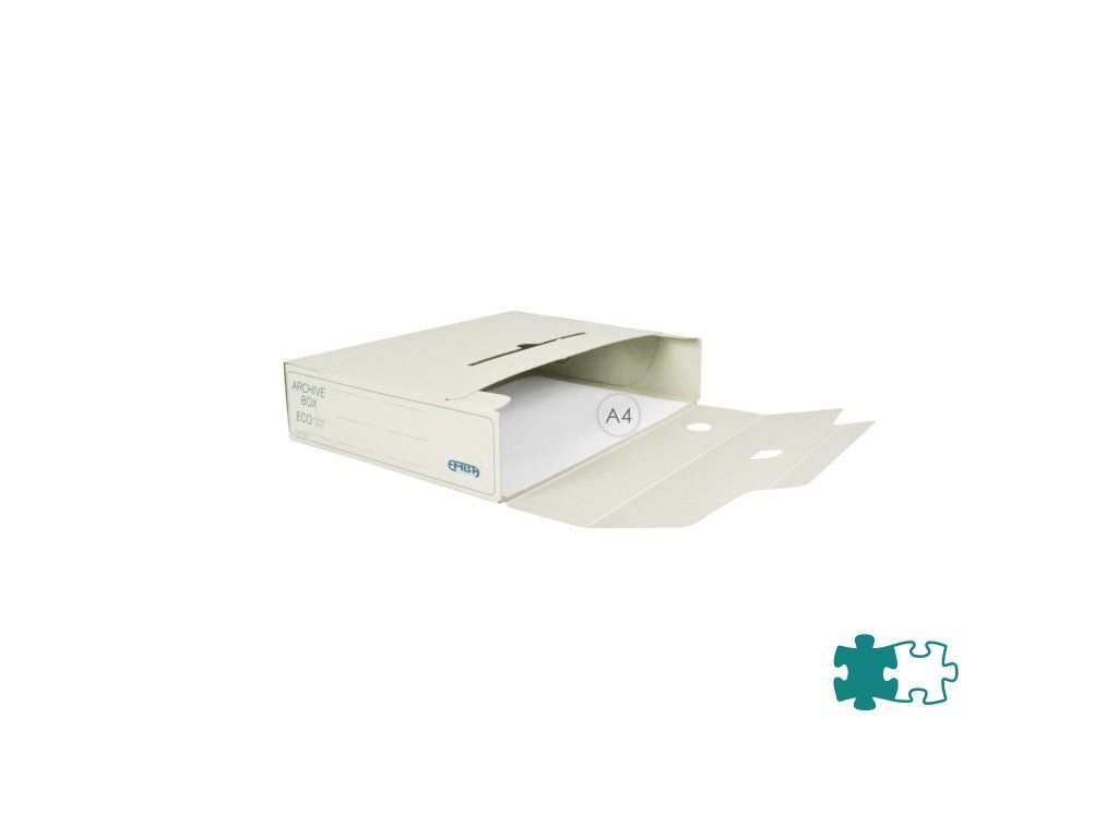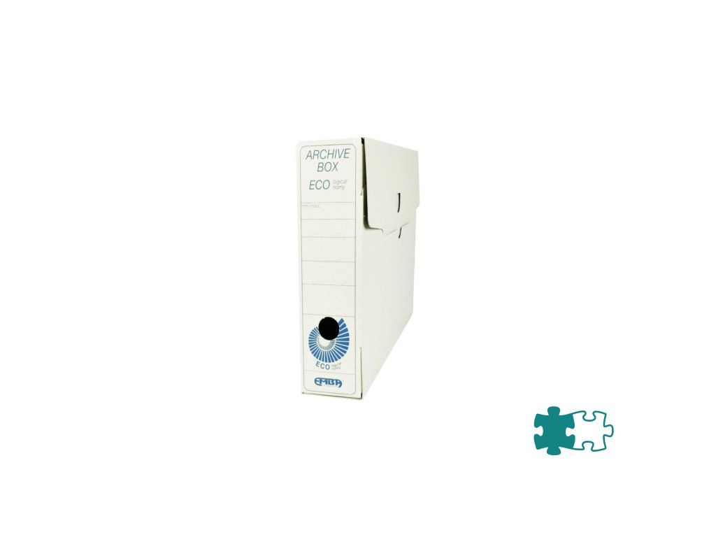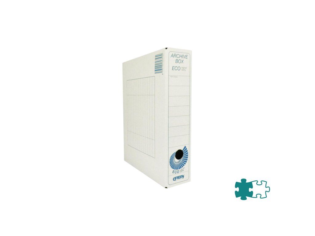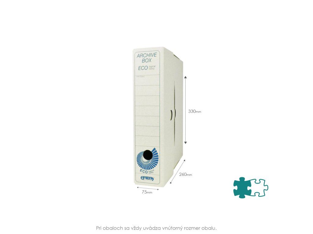 Archívny box ECO A4 sa používa pri rozdelení agendy, účtovných rokov alebo ako firemná farba. Vyrobený z lepenky hrúbky 0,9 mm. Možnosť prehľadného popisu, uloženie v troch polohách. Vhodný v kombinácii so skupinovým boxom - možnosť vložiť 5 boxov I/ 75/ ECO. Ekologicky šetrný výrobok z hladkej ručnej lepenky, 1 000 g/ m². Rozmery 75 × 325 × 240 mm. Dodávaný v rozloženom stave. Väčšie balenie 25 ks.Dodatočné parametre