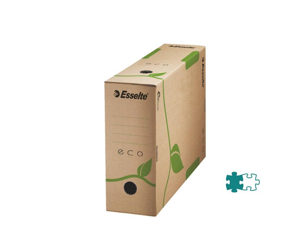 Box z archivačného systému Esselte ECO navrhnutý so zeleným prístupom. 100% recyklovateľný s 85% podielom spotrebiteľského odpadu, certifikovaný FSC. Veľkosť optimalizovaná iba na papiere A4 s cieľom minimalizovať odpad pri výrobe.Rozmery (š x v x h): 100 x 233 x 327 mm