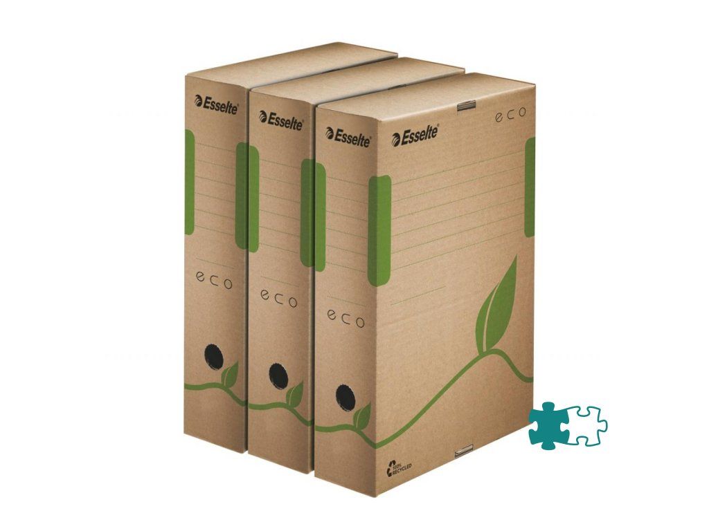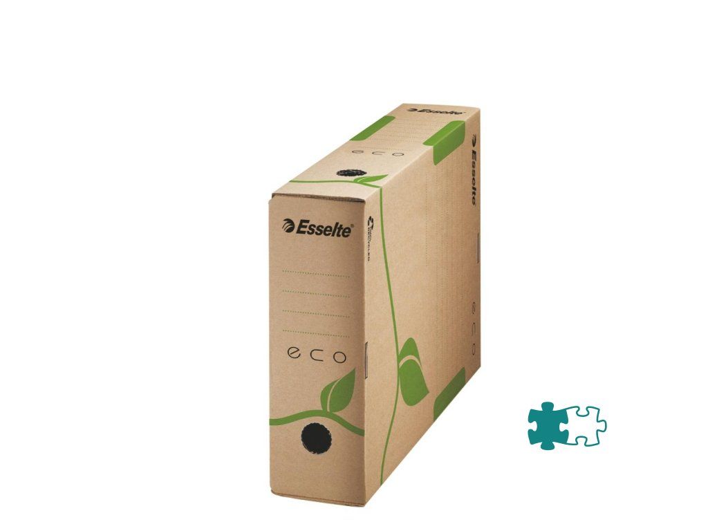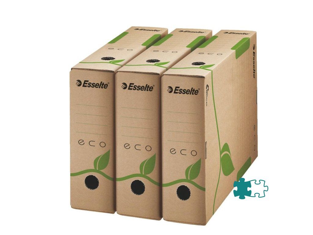 Box z archivačného systému Esselte ECO navrhnutý so zeleným prístupom. 100% recyklovateľný s 85% podielom spotrebiteľského odpadu, certifikovaný FSC. Veľkosť optimalizovaná iba na papiere A4 s cieľom minimalizovať odpad pri výrobe.Rozmery (š x v x h): 80 x 233 x 327 mm
