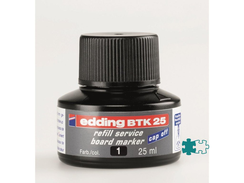 Atrament slabého zápachu s kapilárnym systémom na dopĺňanie popisovačov edding 250, 360, 361 a 363, určených na biele tabule. Tento chemický prípravok je nebezpečný. Obsah fľaštičky 25 ml.Pri doĺňaní vložte prednú časť popisovača špičkou do fľaštičky a po niekoľkých minútach bude popisovač pripravený k opätovnému použitiu.Farba: čierna