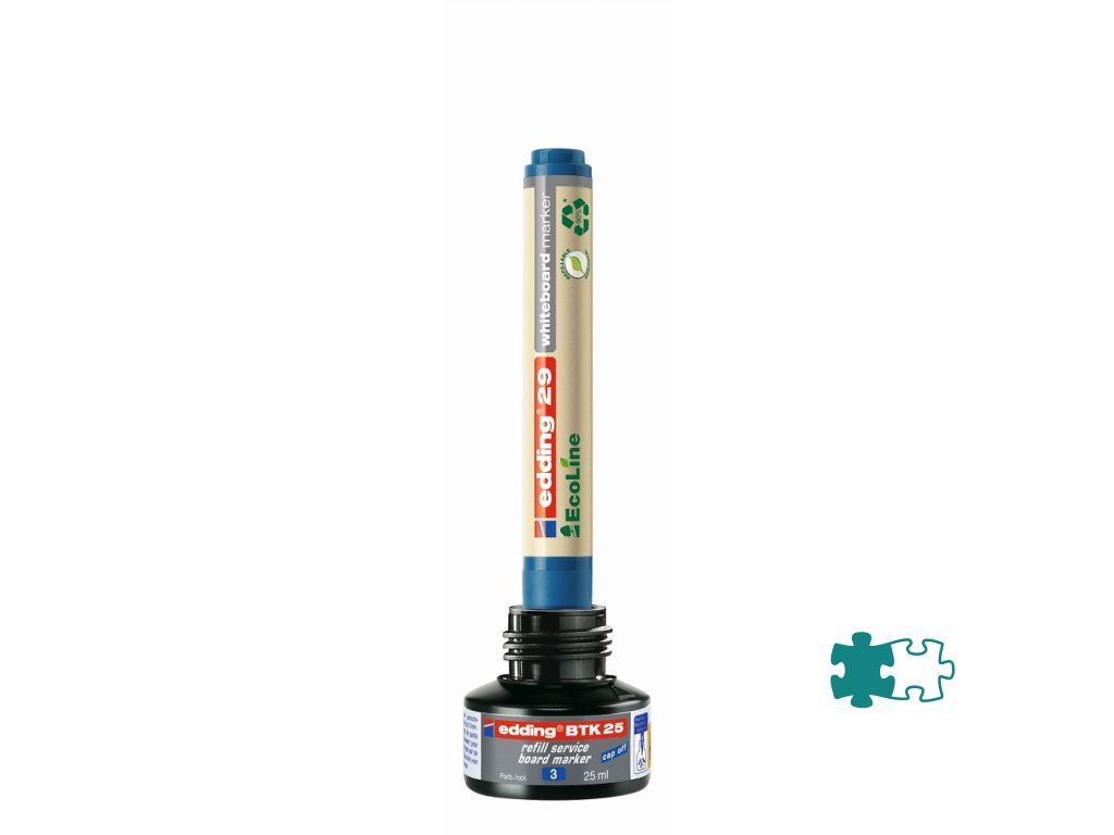 Atrament slabého zápachu s kapilárnym systémom na dopĺňanie popisovačov edding 250, 360, 361 a 363, určených na biele tabule. Tento chemický prípravok je nebezpečný. Obsah fľaštičky 25 ml.Pri doĺňaní vložte prednú časť popisovača špičkou do fľaštičky a po niekoľkých minútach bude popisovač pripravený k opätovnému použitiu.Farba: modrá