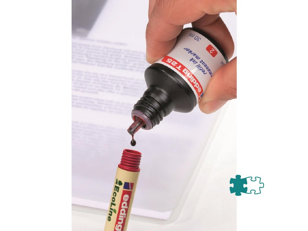 Atrament s kvapkovým dávkovačom na dopĺňanie permanentných popisovačov edding 2000 C, 2200 C, 400, 500, 550, 800, 850, 370 a 390. Pri dopĺňaní vložte prednú časť popisovača špičkou do fľaštičky a po niekoľkých minútach bude popisovač pripravený k opätovnému použitiu. Obsah 30 ml. Tento chemický prípravok je nebezpečný.Farba: červená