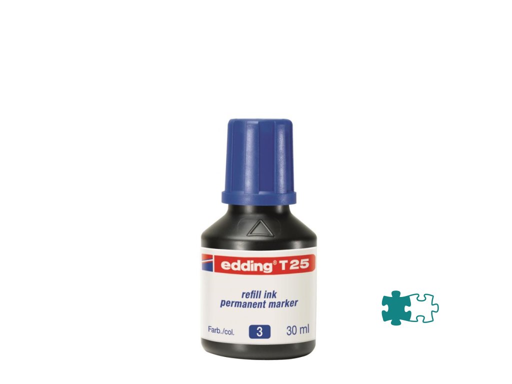 Atrament s kvapkovým dávkovačom na dopĺňanie permanentných popisovačov edding 2000 C, 2200 C, 400, 500, 550, 800, 850, 370 a 390. Pri dopĺňaní vložte prednú časť popisovača špičkou do fľaštičky a po niekoľkých minútach bude popisovač pripravený k opätovnému použitiu. Obsah 30 ml. Tento chemický prípravok je nebezpečný.Farba: modrá