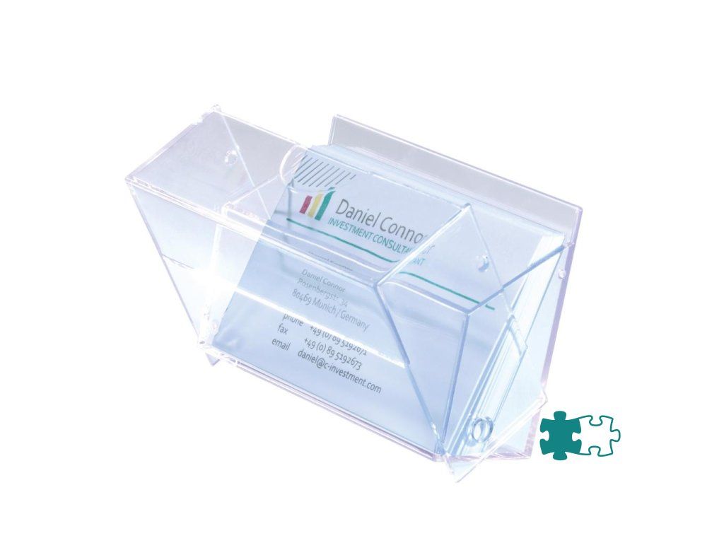 Priehľadný box na vizitky vyrobený z tvrdého plastu s praktickou doplnkovou funkciou: pri zatvorení bezpečne uchováva vložené vizitky a pri otvorení sa zmení na displej s vizitkami. Kapacita až 100 vizitiek (max. 86 × 56 mm). Vonkajšie rozmery (š × h × d) 95 × 60 × 30 mm.Dodatočné parametre