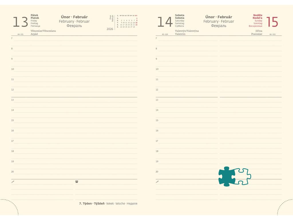 Ide o vysokokvalitnú, na dotyk príjemnú koženku, ktorá dokonale imituje kožu. Ide o lesklý materiál, do ktorého sa výborne razí bez fólie.Diár obsahuje: osobné údaje, plánovač dovolenky (mesačný prehľad), plánovací kalendár, telefónne predvoľby, štátne sviatky Českej a Slovenskej republiky, medzinárodné sviatky, ročný výhľad, denný layout, adresár, mapa Európy a Českej a Slovenskej republiky.