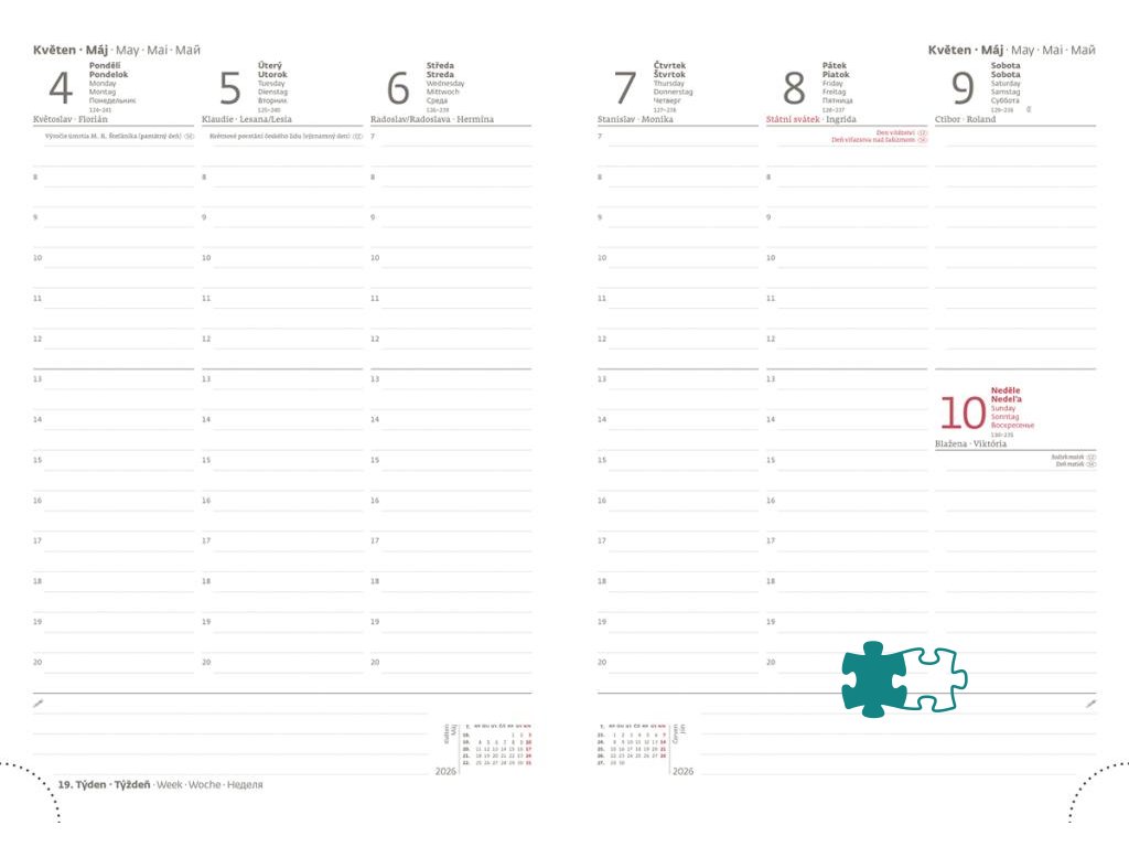 Povrch diára je vyrobený z univerzálneho materiálu na báze zušľachteného papiera, ktorý vďaka svojej jemnej štruktúre získava vzhľad koženky. Odporúčame razbu cez fóliu, prípadne potlač povrchu sieťotlačou.Diár obsahuje: osobné údaje, plánovač dovolenky (mesačný prehľad), plánovací kalendár, telefónne predvoľby, štátne sviatky Českej a Slovenskej republiky, medzinárodné sviatky, ročný výhľad, týždenný layout, adresár, mapa Európy a Českej a Slovenskej republiky.