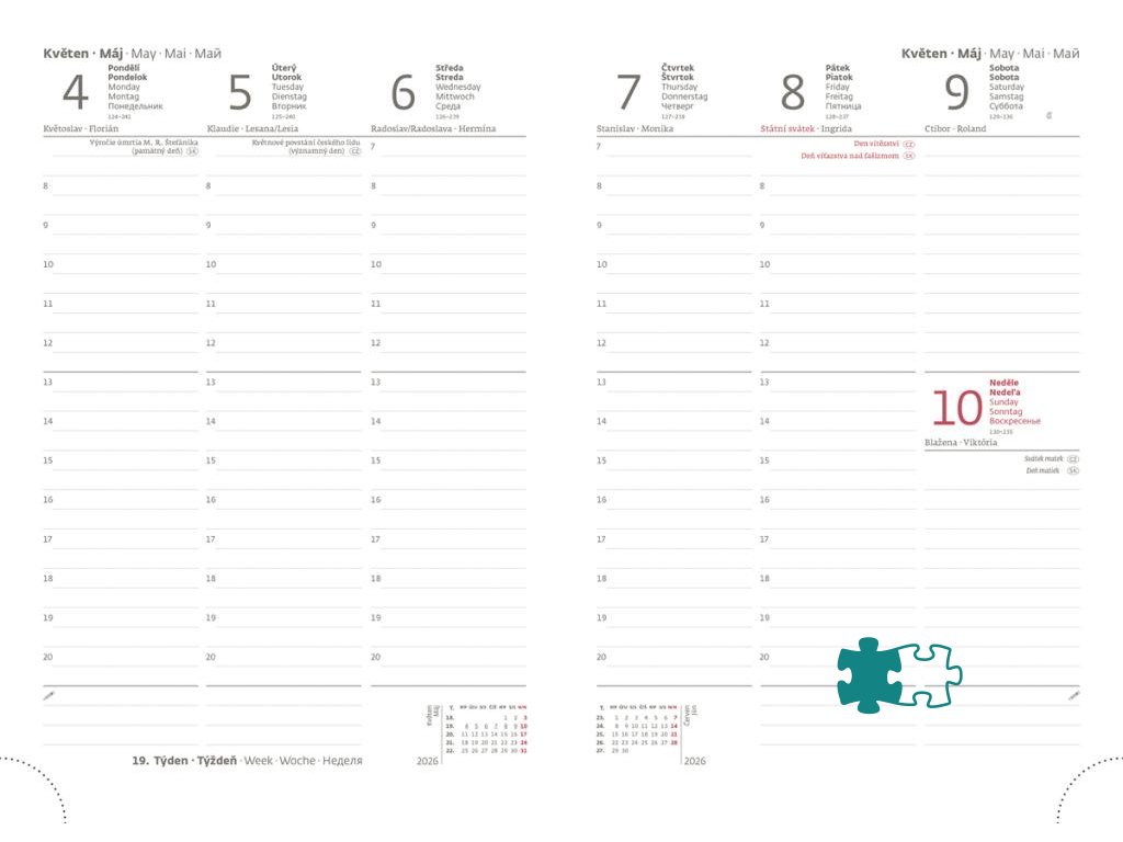 Matná koženka Vivella predstavuje kvalitný, na dotyk príjemný a zároveň veľmi obľubený materiál. Hrúbka materiálu umožňuje dosiahnuť perfektné výsledky pri razbe bez fólie.Diár obsahuje: osobné údaje, plánovač dovolenky (mesačný prehľad), plánovací kalendár, telefónne predvoľby, štátne sviatky Českej a Slovenskej republiky, medzinárodné sviatky, ročný výhľad, týždenný layout, adresár, mapa Európy a Českej a Slovenskej republiky.