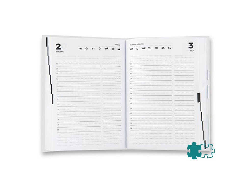 Univerzálny diár na ľubovoľný rok s pevnými laminovanými doskami a šitou väzbou.Denný záznam, každý deň je na jednej strane s časovým rozvrhom 7:00 - 21:00. 192 listov.