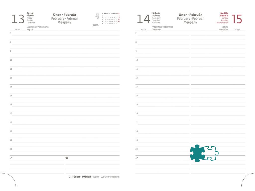Obľubené originálne dizajnové diáre vynikajú doskami, ktoré sú upravené špeciálnym laminovaním s hodvábnym efektom, vďaka čomu sú veľmi príjemné na dotyk. Odporúčame tampónovú tlač.Diár obsahuje: osobné údaje, plánovač dovolenky (mesačný prehľad), plánovací kalendár, telefónne predvoľby, štátne sviatky Českej a Slovenskej republiky, medzinárodné sviatky, ročný výhľad, denný layout, adresár, mapa Európy a Českej a Slovenskej republiky.