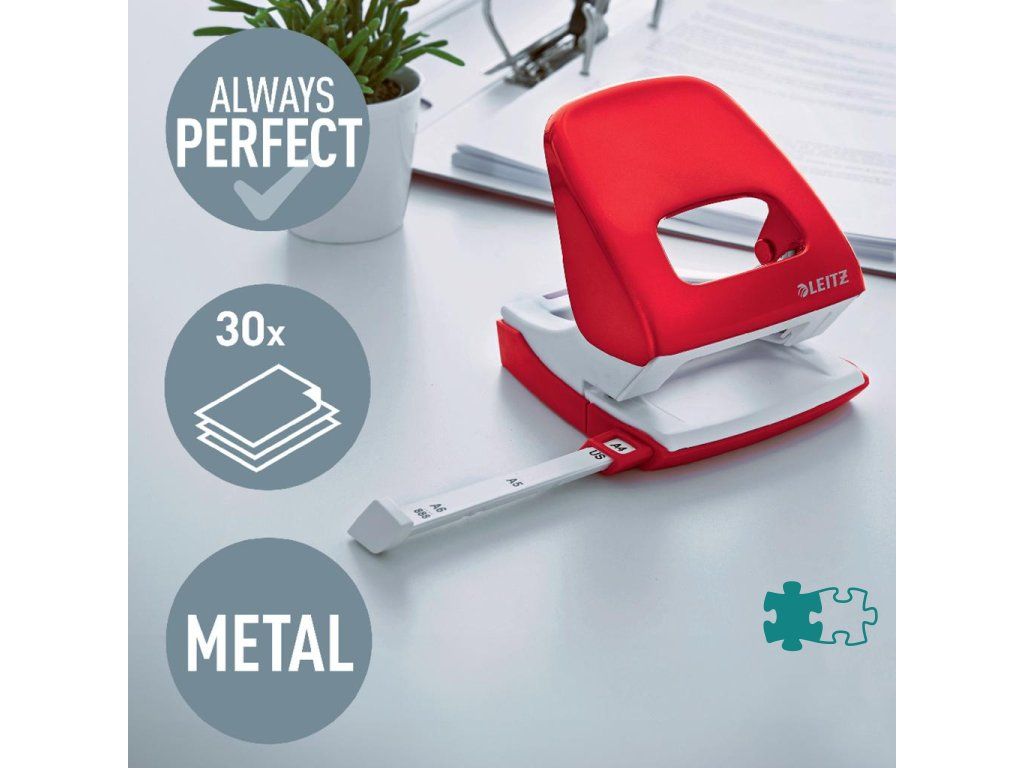 Pevná a spoľahlivá celokovová dierovačka rady WOW v žiarivej farbe. Telo aj rameno vyrobené z kovu, protišmykové plastové dno. Pohodlné vyprázdňovanie odrezkov (dno sa odklopí iba čiastočne), príložník s kontrastnou potlačou formátov, pevná fixácia, patentovaná úchytka a ostrejšie dierovacie segmenty pre vynaloženie menšej sily pri dierovaní. Kapacita dierovania 30 listov. Hmotnosť 378 g. 10 ročná záruka. Farba: červená.Dodatočné parametre