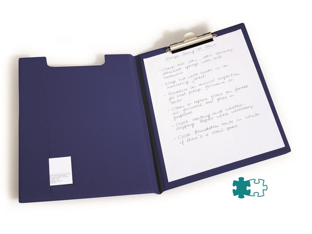 Dosky vyrobené zo spevneného mäkkého PVC. Vrecko po celej dĺžke vnútornej strany predného obalu. Vhodné na dokumenty formátu A4.Farba: tmavomodrá