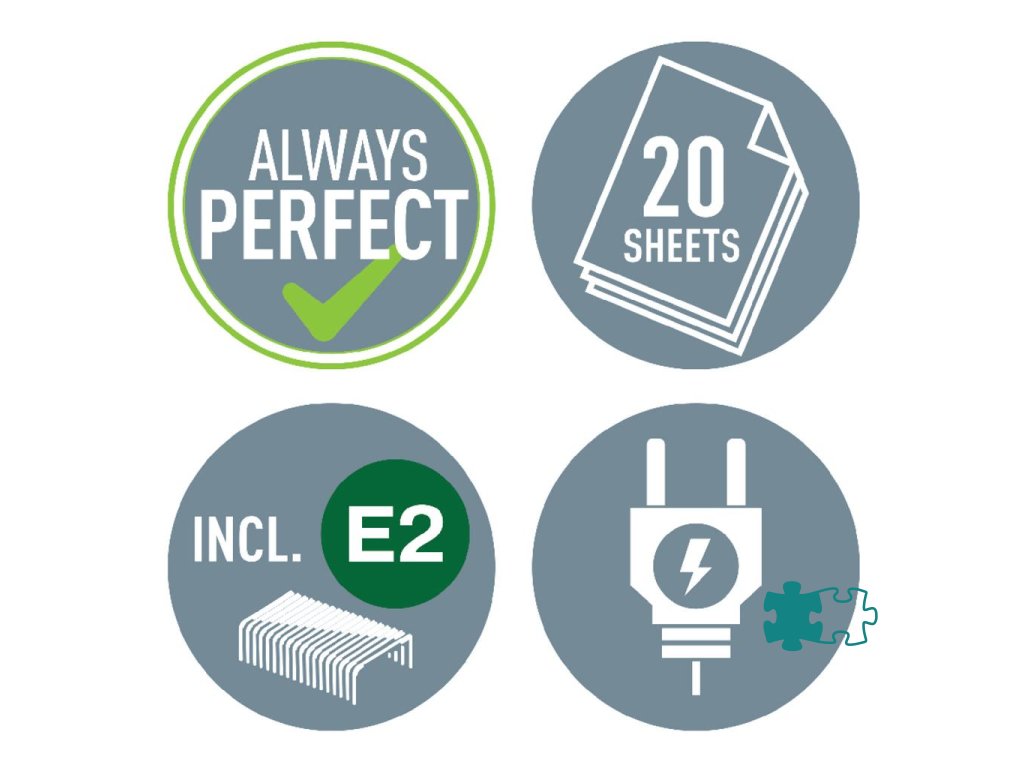 Rýchle zošívanie bez námahy. Ideálna na časté použitie. Vysoký výkon. Jednoduché ovládanie jednou rukou. Plochá technológia ušetrí pri archivovaní až 30 % miesta. Drôtiky Leitz Electric E2 zaručujú pri každom použití dokonalé zošitie bez zasekávania. Kapacita zošívania: 20 hárkov (80 g/m2)Dodatočné parametre