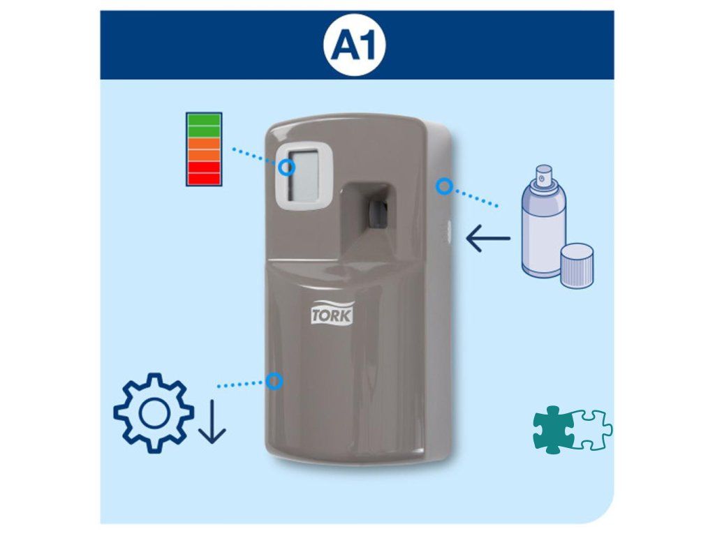 Tork zásobník na osviežovač vzduchu v spreji má dobrú funkčnosť a rôzne vonné náplne, ktoré pozdvihnú atmosféru každej toalety.- Aerosólový systém s flexibilnými možnosťami programovania