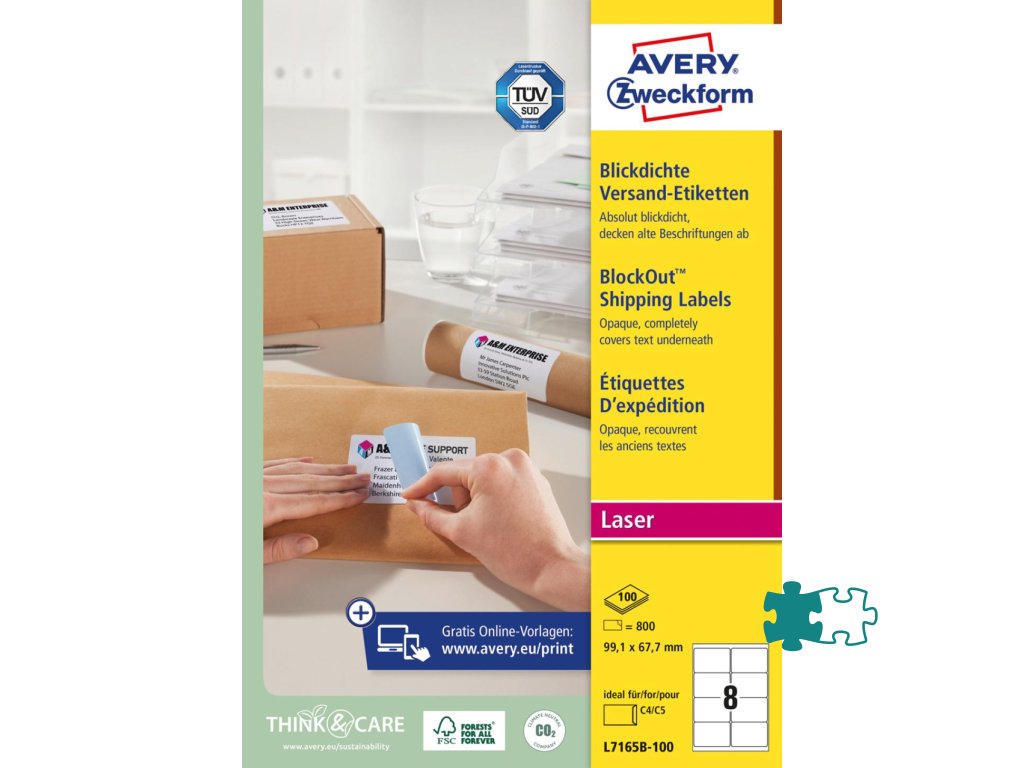 Biele etikety vhodné ako prepravné štítky na zásielky. Vďaka inovatívnej technológii ultragrip sa môžete spoľahnúť na bezchybné natiahnutie archu a tlač bez zasekávania. Bezpečnostný okraj QCT zabraňuje zanášaniu tlačiarne lepidlom. Rýchla technológia QuickPEEL™ zabezpečí, že etiketu odlepíte z podkladového papiera za sekundu. Šablóny a softvér pre jednoduchú a rýchlu tlač etikiet sú k dispozícii zdarma na www.avery-zweckform.cz/software/avery-design-print. Sú vhodné pre všetky štandardné laserové tlačiarne. Pre laserové tlačiarne testované a certifikované TÜV SÜD. Rozmer 99,1 x 67,7 mm. Balenie 100 hárkov.Dodatočné parametre