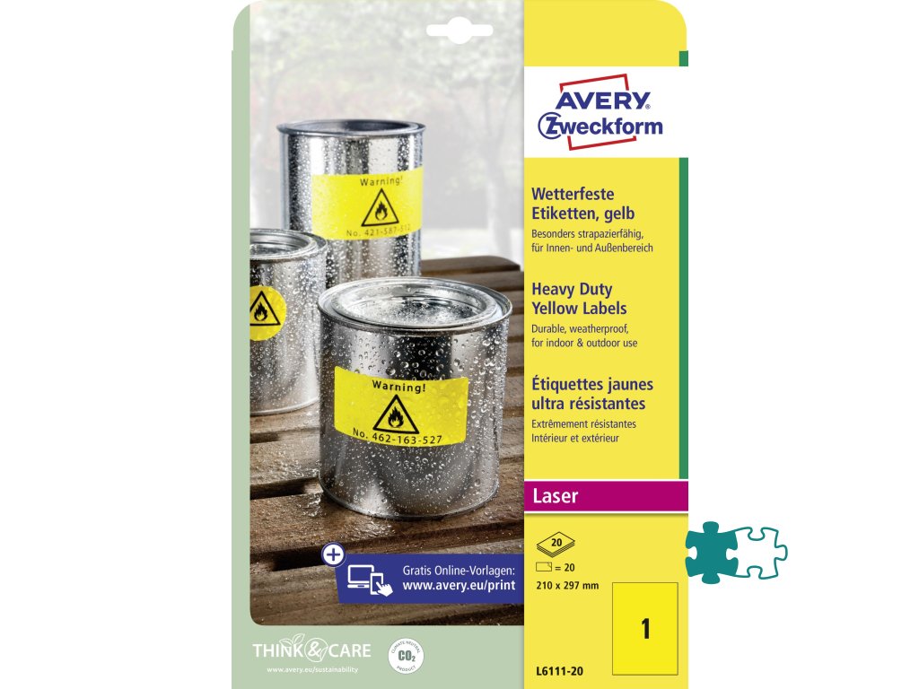 a vhodné aj pre vonkajšie použitie. Rozmery v mm : 210 × 297. Farba žltá. Etikety na hárku 1 kus. Balenie 20 hárkov.