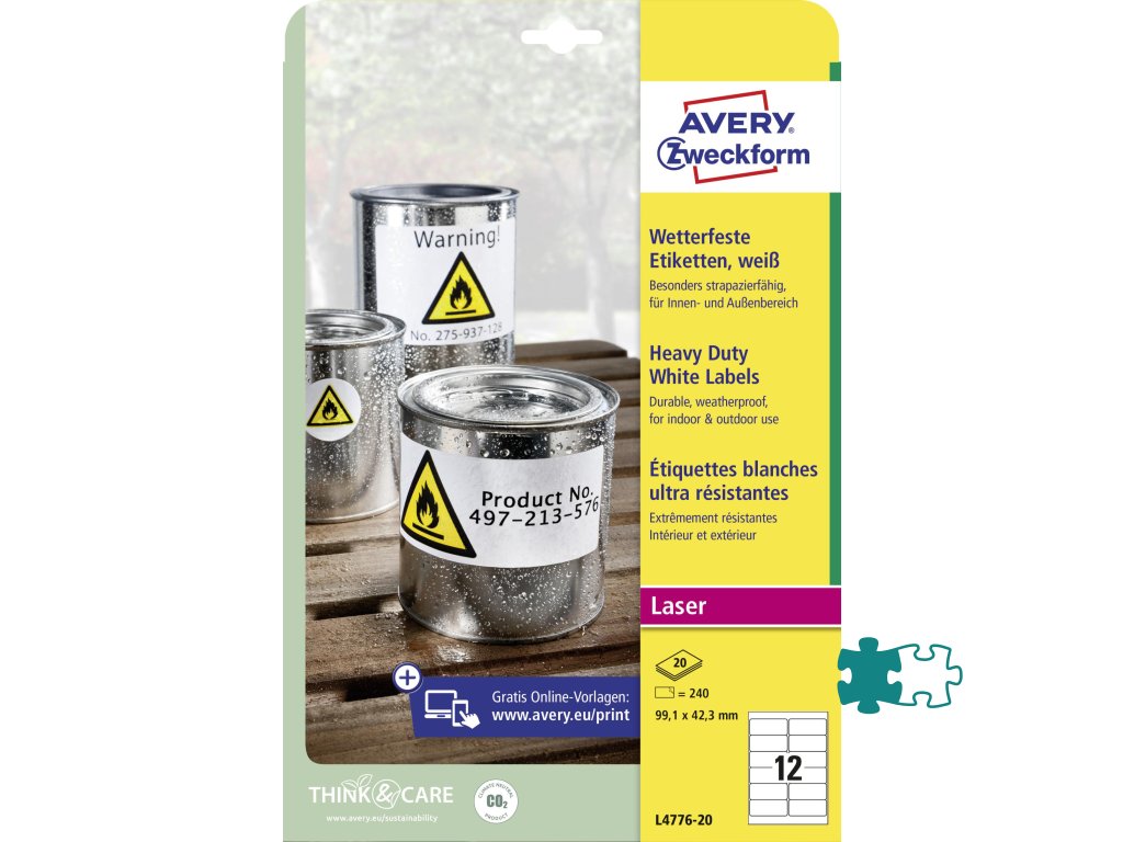Veľmi odolné polyesterové etikety odolné voči oleju, prachu, špine, natrhnutiu, vode. Odolné voči teplotám od -20° do +80°C. Sú určené pre tlač v laserových, farebných laserových tlačiarňach a kopírkach a sú vhodné aj pre vonkajšie použitie.Rozmery v mm : 99,1 × 42,3. Farba biela. Etikety na hárku 12 kusov. Balenie 20 hárkov.