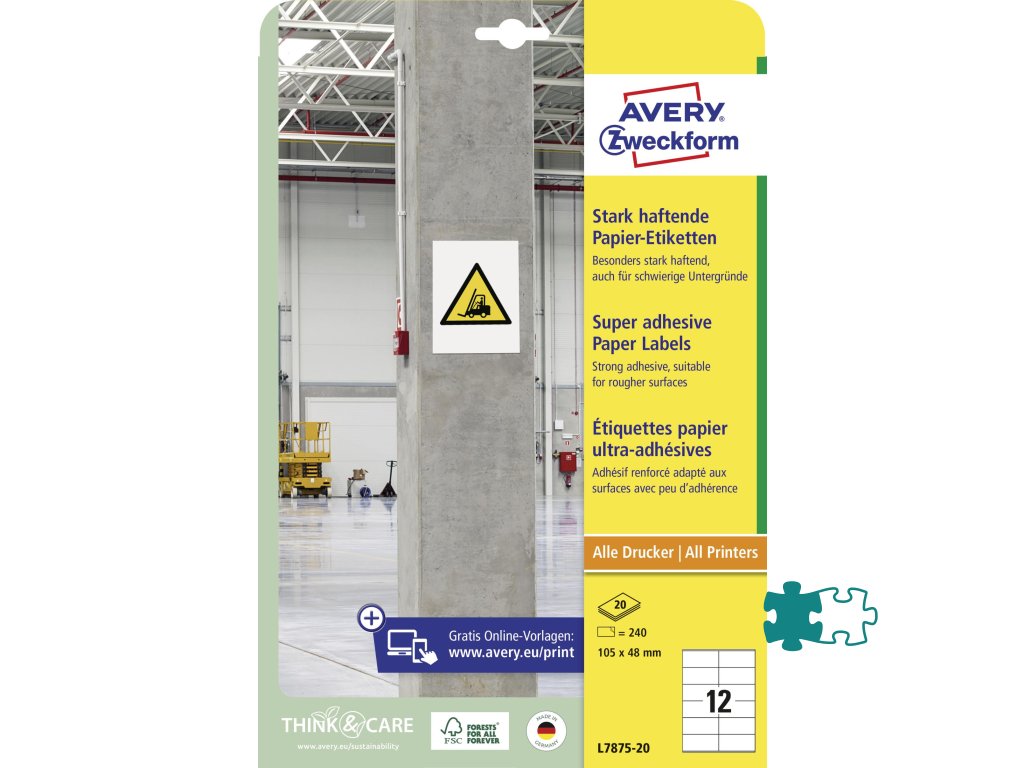 Silná priľnavosť, vysoká bezpečnosť. Zvlášť vhodné na označovanie a označovanie produktov a inventára a na vytváranie varovných a bezpečnostných upozornení v interiéri! Biele, extrémne priľnavé papierové etikety vo formáte 105 x 48 mm sú dvakrát pevnejšie ako bežné papierové etikety. Papierové štítky sa lepia aj na ťažké povrchy, ako sú nerovné, drsné, vlhké alebo zaprášené povrchy pri rôznych teplotách. Môžete sa spoľahnúť na zaručený chod tlačiarne bez zaseknutia bez akýchkoľvek usadenín lepidla v tlačiarni. Etikety je možné tlačiť na všetkých bežných laserových a atramentových tlačiarňach.Dodatočné parametre