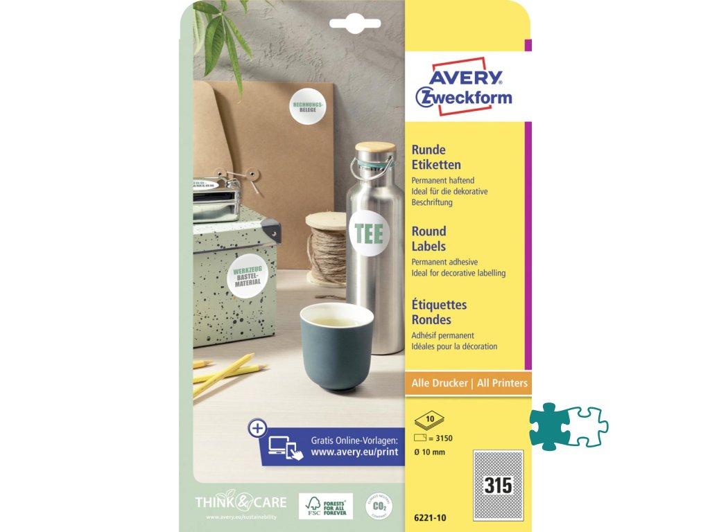 Biele kruhové univerzálne etikety vhodné na každodenné použitie v atramentových a laserových tlačiarňach a kopírovacích strojoch. Ostrá tlač bez bez rozmazávania. Etikety su vyrobené spôsobom šetrným k životnému prostrediu, majú certifikáciu FSCR, sú bielené bez použitia chlóru. Šablóny a softvér pre jednoduchú a rýchlu tlač etikiet k dispozícii zdarma. Formát A4. Balenie 10 hárkov. Priemer 10 mm.Dodatočné parametre