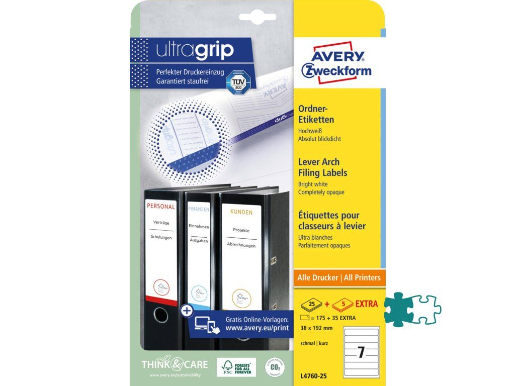 100% krycie papierové etikety na prelepenie neaktuálnych štítkov na chrbtoch zakladačov. Sú vhodné pre tlač vo všetkých druhov tlačiarní a kopíriek. Vďaka inovatívnej technológie ultragrip sa môžete spoľahnúť na bezchybné natiahnutie archu a tlač bez zasekávania. Rozmery v mm : 38 × 192. Farba biela. Etikety na hárku 7 kusov. Balenie 25 + 5 hárkov.Dodatočné parametre