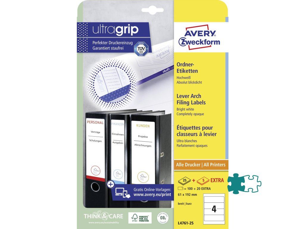 100% krycie papierové etikety na prelepenie neaktuálnych štítkov na chrbtoch zakladačov. Sú vhodné pre tlač vo všetkých druhov tlačiarní a kopíriek. Vďaka inovatívnej technológie ultragrip sa môžete spoľahnúť na bezchybné natiahnutie archu a tlač bez zasekávania. Rozmery v mm : 61 × 192. Farba biela. Etikety na hárku 4 kusy. Balenie 25 + 5 hárkov.Dodatočné parametre
