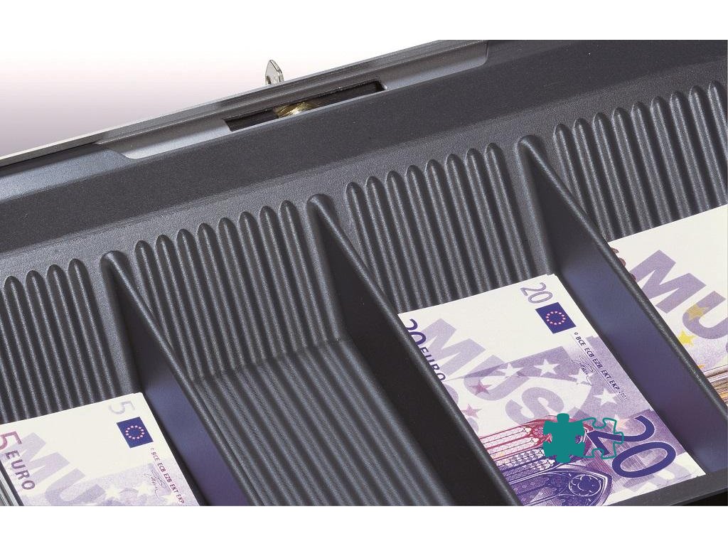 Pokladnička z povrchovo upravenej ocele vybavená mincovou priehradkou s ôsmimi oddielmi na eurá a centy v maximálnej hodnote 233,90 Euro. Štyri prístupné priehradky na bankovky, priestor na poukážky a stravné lístky v spodnej časti. Vnútorné časti vyrobené z nárazu vzdorného materiálu.Sklápateľné ergonomicky tvarované madlo prispieva k dobrému držaniu, pena na vnútornej strane veka zabraňuje premiešaniu mincí pri prenose, dvojzápadkový zámok zvyšuje bezpečnosť. Pokladničky sú vzájomne stohovateľné.Rozmery: 352×120×276 mm