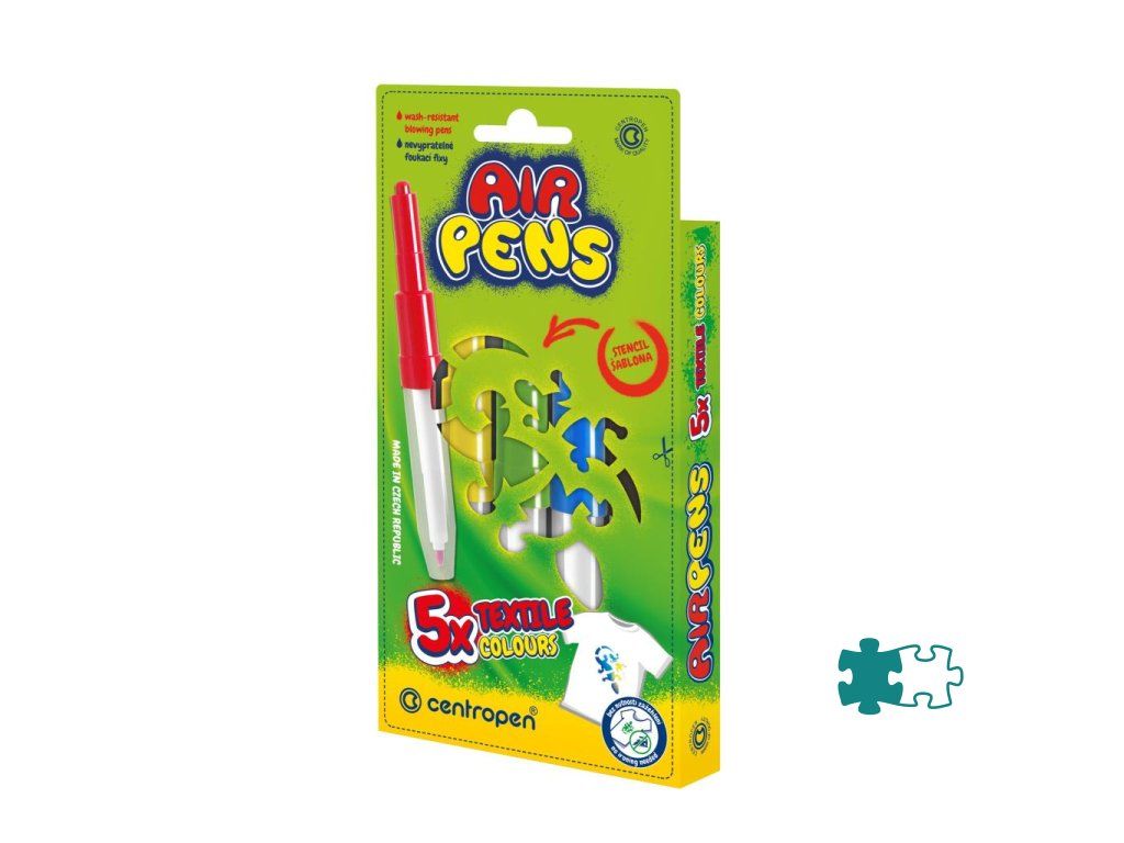 Fúkacie fixy na textil v sade 5 ks s 1 šablónou. Zdraviu neškodlivý atrament. Kresby odolajú praniu do 60 °C bez nutnosti zažehlenia.Dodatočné parametre