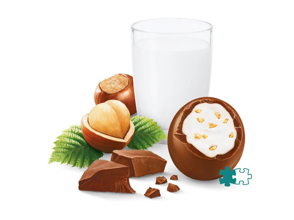 Mliečna čokoláda 50% (cukor, sušené plnotučné mlieko, kakaové maslo, kakaová hmota, emulgátor: lecitíny (sójové), aróma), Cukor, Sušené odtučnené mlieko, Palmový olej, Lieskovce (5,8 %), Maslový tuk, Čokoláda (cukor, kakaová hmota, kakaové maslo, emulgátor: lecitíny (sójové), aróma), Leštiace látky: (arabská guma, šelak), Glukózový sirup, Emulgátor: lecitíny (sójové), Arómy, Obsah mliečnej sušiny: najmenej 28 % z celkovej hmotnosti, Obsah kakaových zložiek: najmenej 16 % z celkovej hmotnosti.