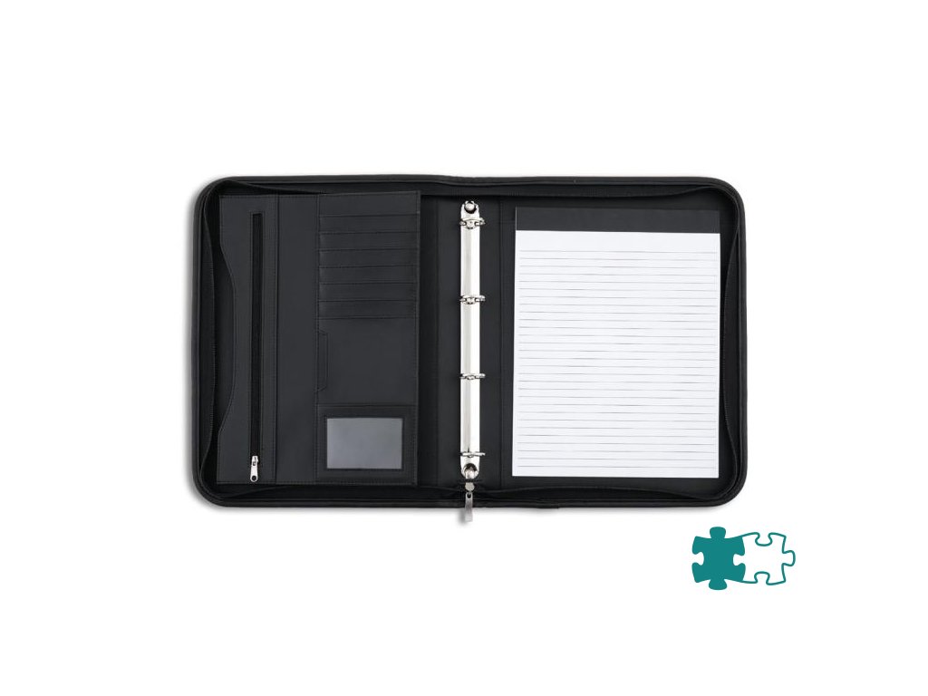 Konferenčná mapa so zipsom a rukoväťou na prenášanie, vybavená 4-krúžkovou mechanikou, vreckami niekoľkých veľkostí. V prevedení imitácie kože, úprava matná. Šírka chrbta 47 mm.Farba: čierna