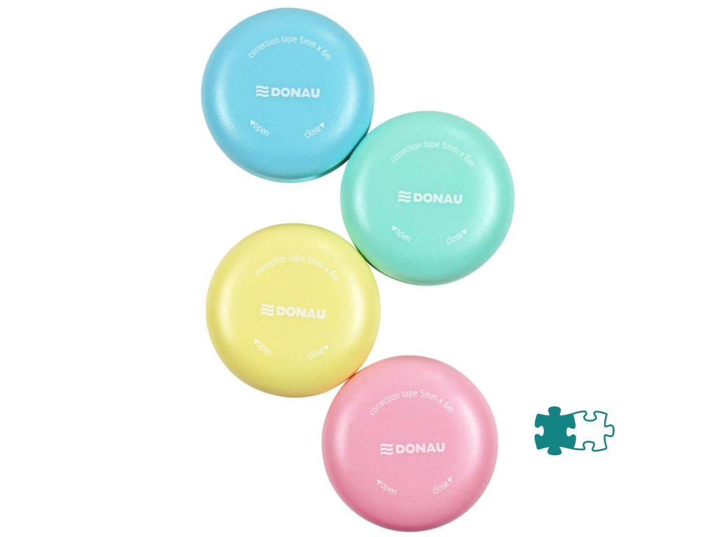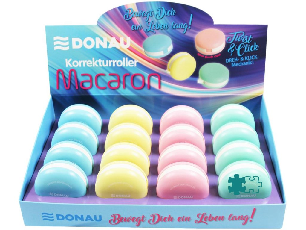 Korekčný roller v tvare makrónky, 16 ks na displeji, 4 rôzne farby tela, priemer 5 cm, dĺžka pásky 6 m, šírka pásky 5 mm, otváranie a zatváranie pomocou mechanizmu twist & click.Dodatočné parametre