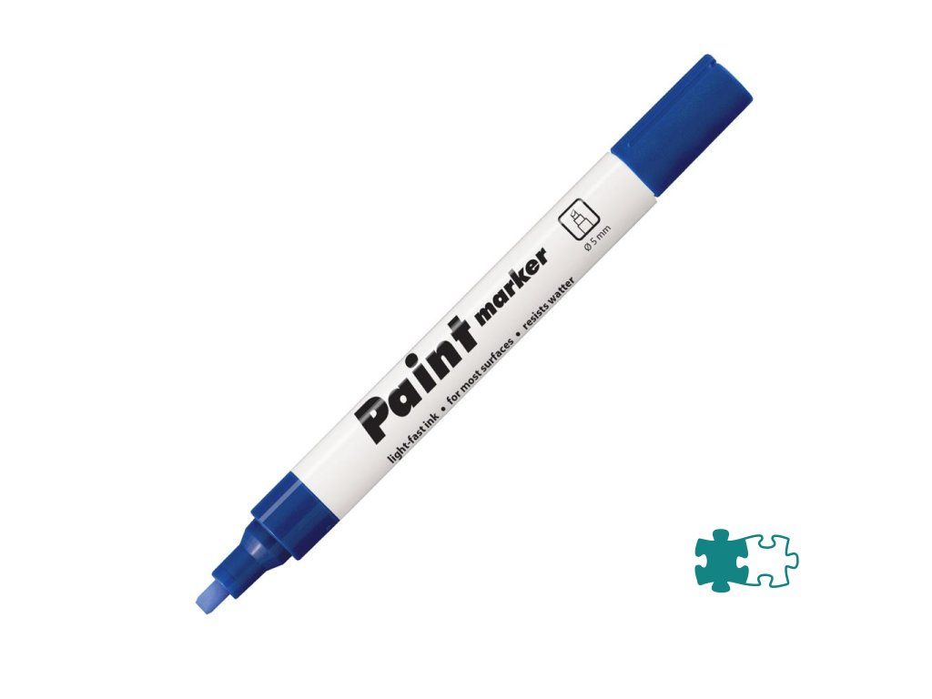 Lakový popisovač vhodný na neporézne povrchy. Svetlostály atrament po zaschnutí odolá vode, poveternostným vplyvom aj oderu. Hrot zrezaný, šírka stopy 1 - 5 mm. Väčšie balenie 10 ks v jednej farbe. Farba modrá.Dodatočné parametre