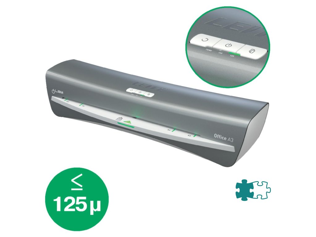 Moderný a kompaktný laminovací prístroj Leitz iLAM Office spája štýl a efektivitu. Tento laminátor vo formáte A3 garantuje ľahké laminovanie, vyznačuje sa rýchlym intervalom zahrievania len za 1 minútu, dokument A4 v 80-mikrónovej kapse na laminovanie zalaminuje už za obyčajných 36 sekúnd. Pomocou intuitívneho dotykového panelu si môžete vybrať jedno z troch nastavení hrúbky vrecka, prípadne využiť tlačidlo spätného chodu pre ľahké vybratie zaseknutej laminovacej kapsy. Inovatívna stavová SMART LED dióda využíva svetelné a zvukové signály: červená dióda znamená zahrievanie, zelená so zvukovým upozornením oznamuje pripravenosť na laminovanie, blikajúca červená dióda znamená automatické vypnutie po 15 minútach nečinnosti. Navyše šikovné vstupné navádzacie LED diódy zabezpečujú dokonalé vyrovnanie vrecka tak, aby sa zabránilo jeho zaseknutiu. Určené na kapsy od 75 do 125 mikrónov. TUV/GS, CE certifikácia. Šedá a biela farba.