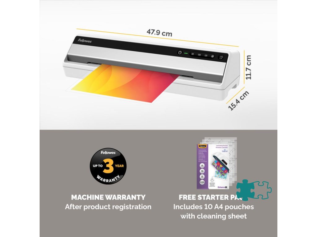 Rada laminátorov na príležitostné laminovanie s technológiou dvoch valcov laminuje fotografie a iné dokumenty do hrúbky fólie 125 mic.. Súčasťou balenia je 10 laminovacích fólií. Šírka vstupu 316 mm. Rýchlosť laminovania 30 cm/ minútu. Veľmi krátka doba nahrievania - 1 min. Predný podávač dokumentu s krytom proti prachu.Dodatočné parametre