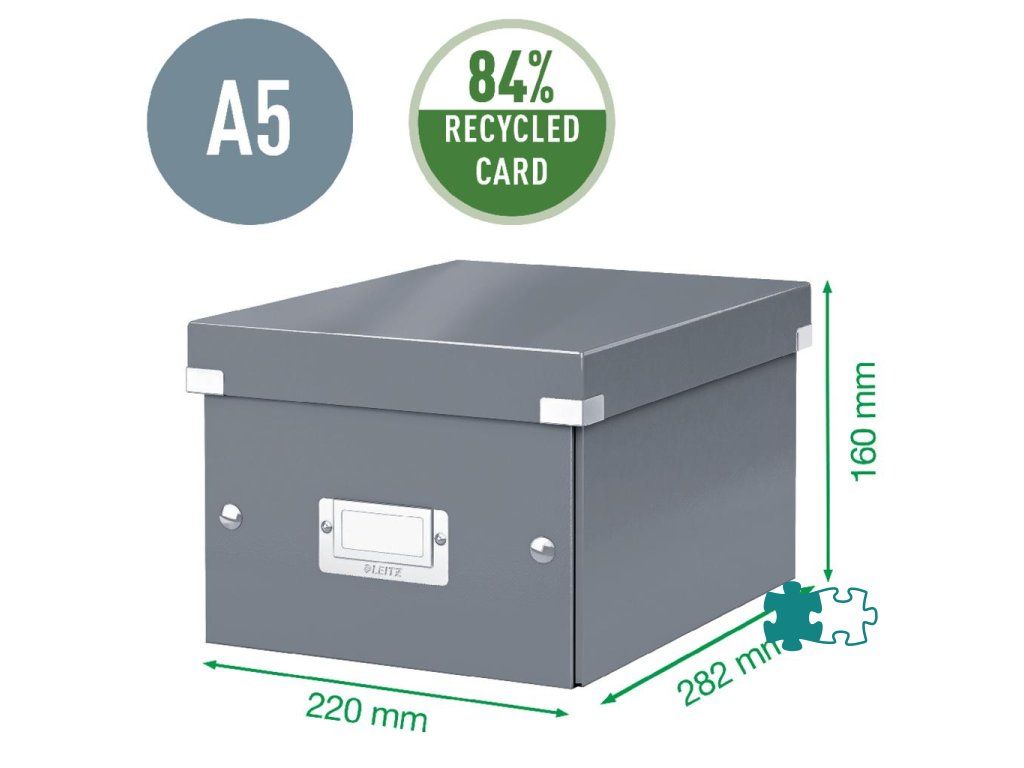 Univerzálna malá archivačná krabica (pre formát A5). Skladacia pre úsporu miesta, keď sa nepoužíva. Rámik na popisovací štítok. Laminovaný povrch a kovové rohy pre lepšiu a trvalejšiu ochranu. Moderný design, ktorý sa bude skvelo vynímať v každej kancelárii. Jednoduché zloženie a vysoká stabilita vďaka vylepšenej konštrukcii krabice. Veľkosť krabice odpovedá bežným kancelárskym rozmerom (na formát A5). Dodajte svojmu pracovnému miestu alebo domácnosti farbu a skombinujte krabicu s ostatnými kancelárskymi výrobkami z radu Leitz WOW. Rámik na štítok pre ľahké popisovanie. Materiál pevný kartón potiahnutý polaminovaným papierom. Vnútorné rozmery (Š x V x H): 200 x 148 x 250 mm. Farba červená.Dodatočné parametre