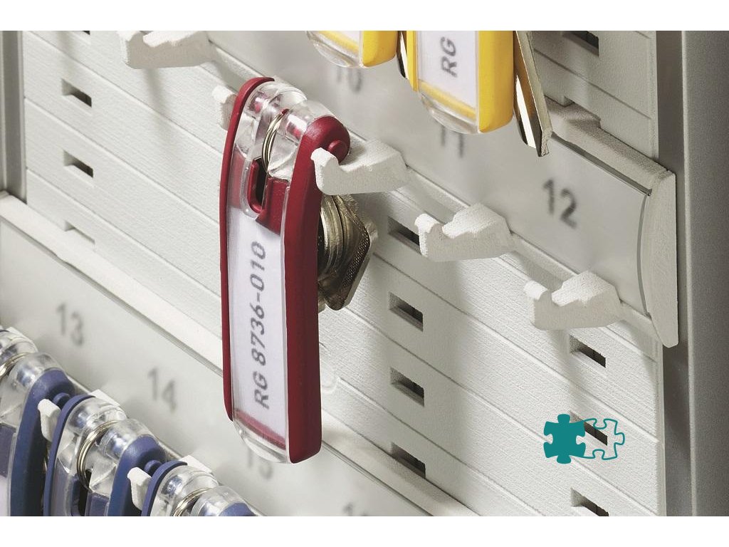 Inovované menovky na kľúče z vysokokvalitného plastu vnášajú do skriniek poriadok a systém a rušia chaos pri doterajšom skladovaní kľúčov. Kľúče visia pod menovkou, a tým je text na menovke zo všetkých strán viditeľný. Výrobu štítkov na menovky je možné voľne stiahnuť z internetovej adresy www.durable.de. Balenie 6 ks.Farba: červená