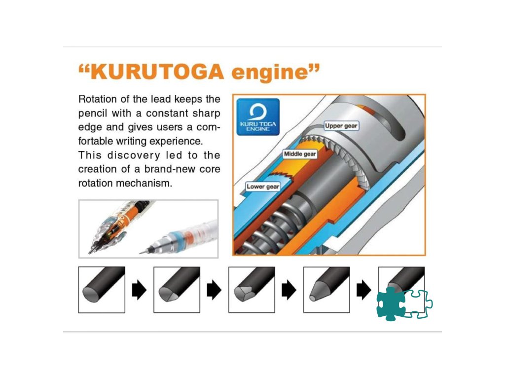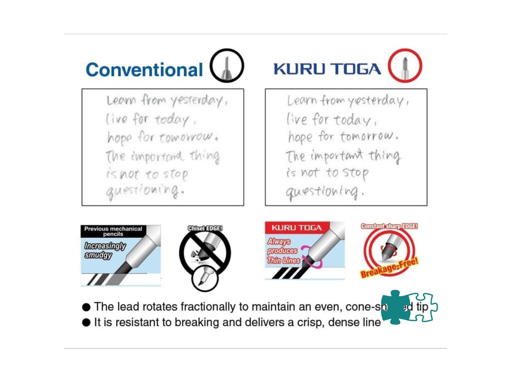 Kuru Toga je spojenie dvoch japonských slov, Kuru „otáčať sa“ a Togaru „byť ostrý“. A presne to vystihuje systém mikroceruzky Kuru Toga. Vďaka jedinečnému mechanizmu, ktorý tuhu otočí zakaždým, keď sa zdvihne z papiera. Línia je vždy ostrá a má stále rovnakú silu kdekoľvek s ňou píšete. Tuha 0,5 mm. Farba tela sivá.Dodatočné parametre