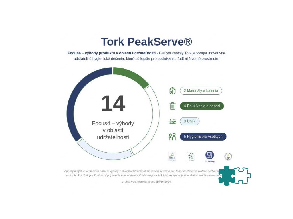 Tork PeakServe®: najnovšia inovácia navrhnutá pre vysoko frekventované toalety a umyvárne, kde personál potrebuje maximalizovať čas upratovania a udržať dobrú plynulosť pre návštevníkov. Systém je kompatibilný s nadväzujúcimi utierkami Tork PeakServe®. Má vysokú kapacitu až 1 230 utierok, ktoré dokáže dávkovať rýchlo a plynulo bez prerušenia. Stlačené náplne sa rýchlo a kedykoľvek dopĺňajú. Ľahko sa uskladňujú a prepravujú, vďaka čomu umožňujú personálu sústrediť sa na upratovanie a nie na dopĺňanie.•Extra tenký dizajn: Atraktívny a šetriaci priestor