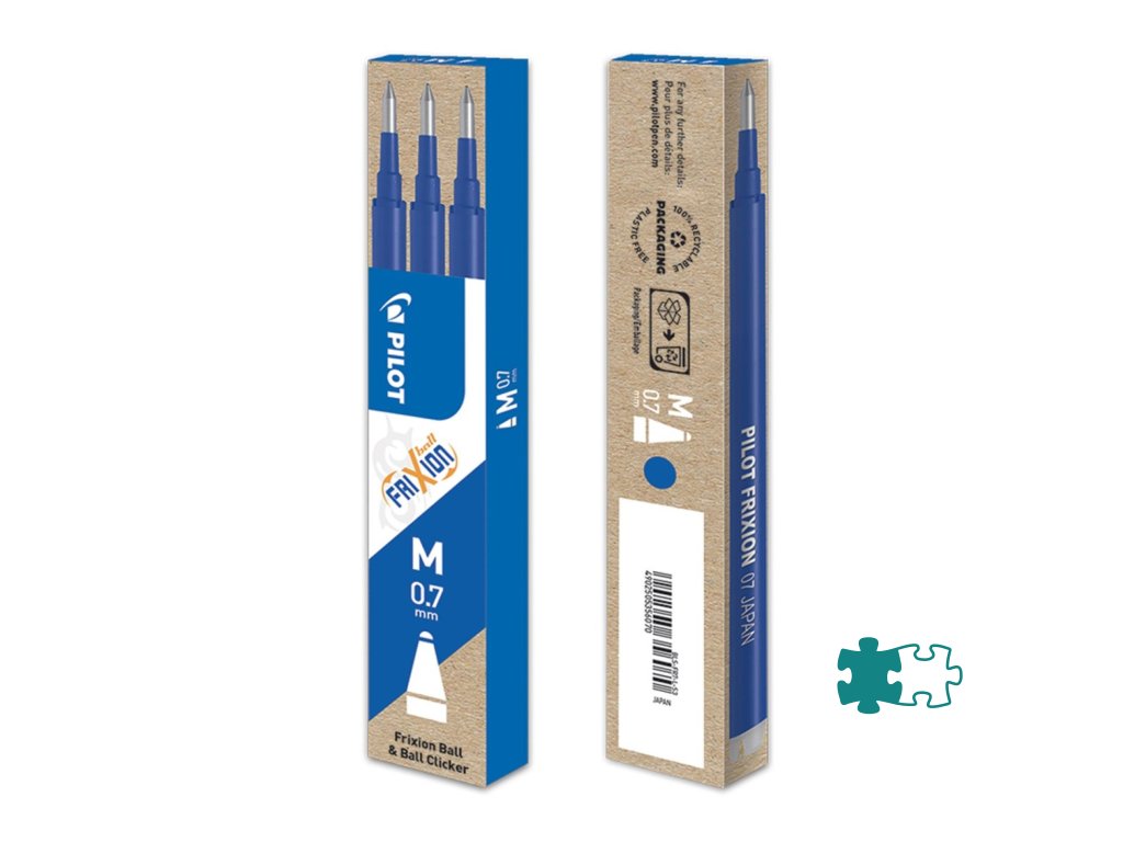 Náplň s prepisovateľným atramentom do rollerov Pilot FriXion Clickera FriXion Ball. V balení 3 ks. Gulička 0,7 mm.Farba modrá.