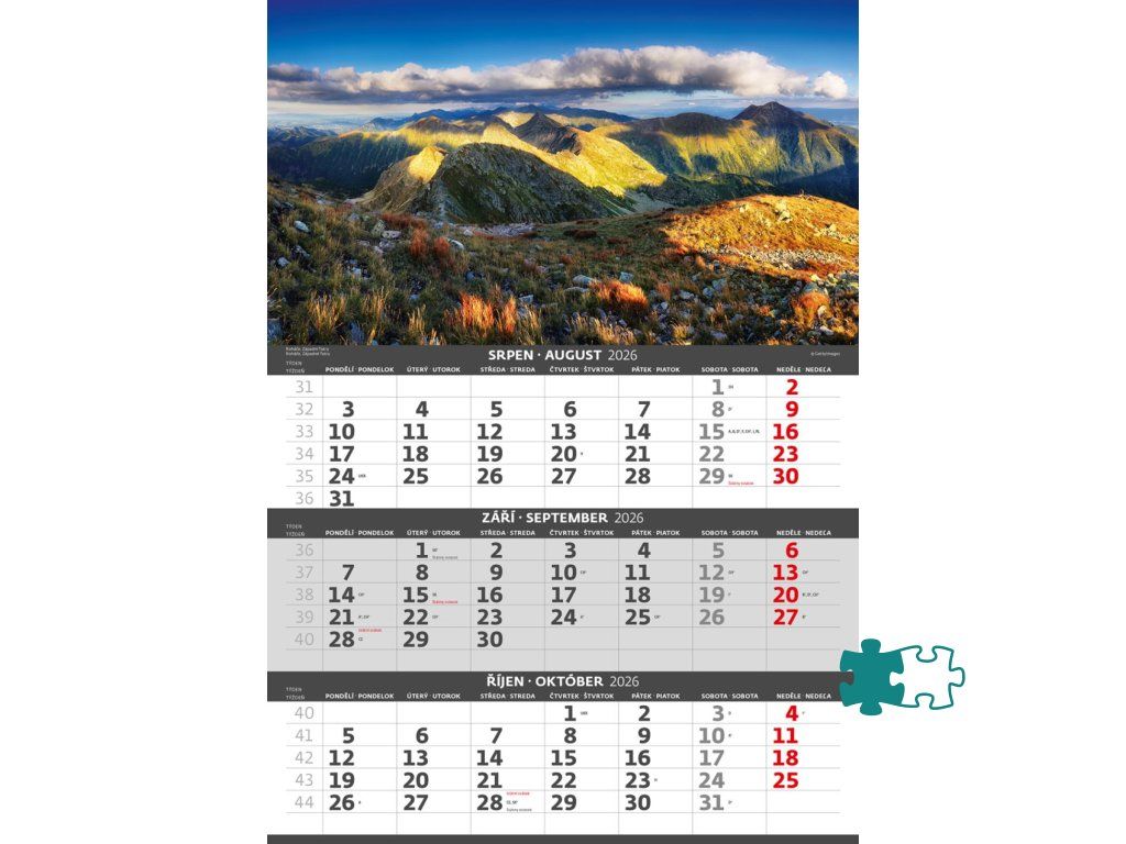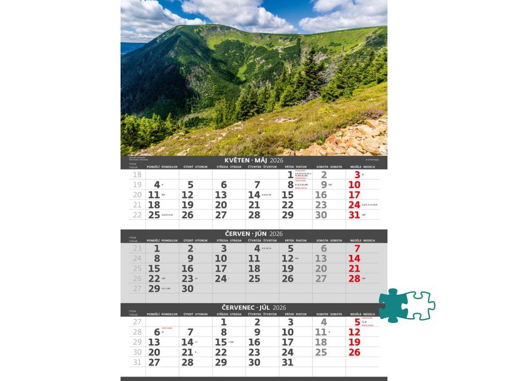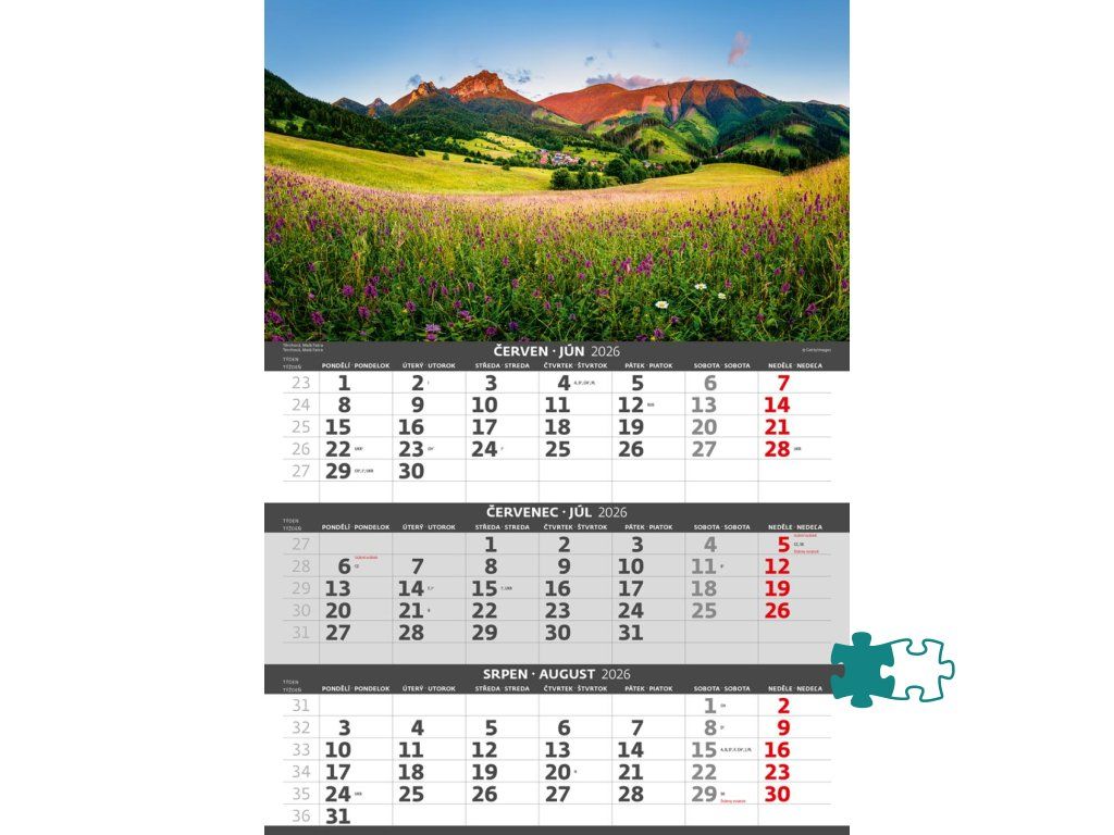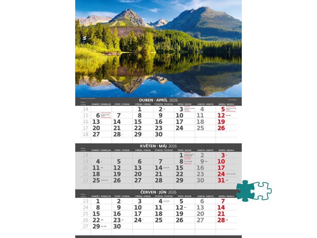 Formát kalendára: 31,5 x 45 cmKalendárium: české/slovenské trojmesačné so sviatkami európskych štátov (CZ / SK / A / B / D / F / H / CH / I / PL / RUS / UKR)
