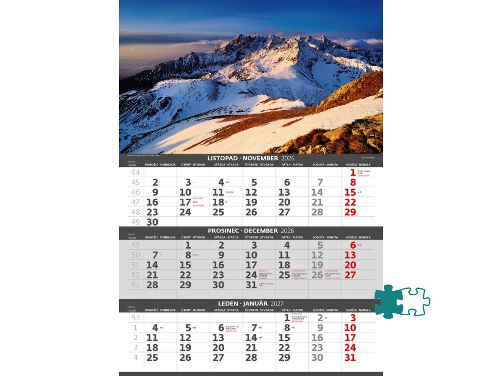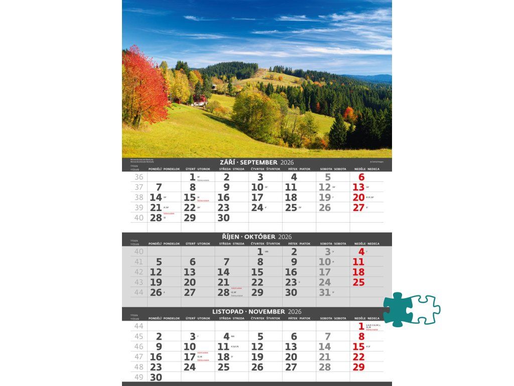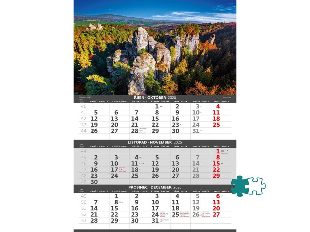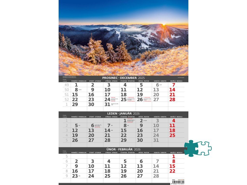 Formát kalendára: 31,5 x 45 cmKalendárium: české/slovenské trojmesačné so sviatkami európskych štátov (CZ / SK / A / B / D / F / H / CH / I / PL / RUS / UKR)