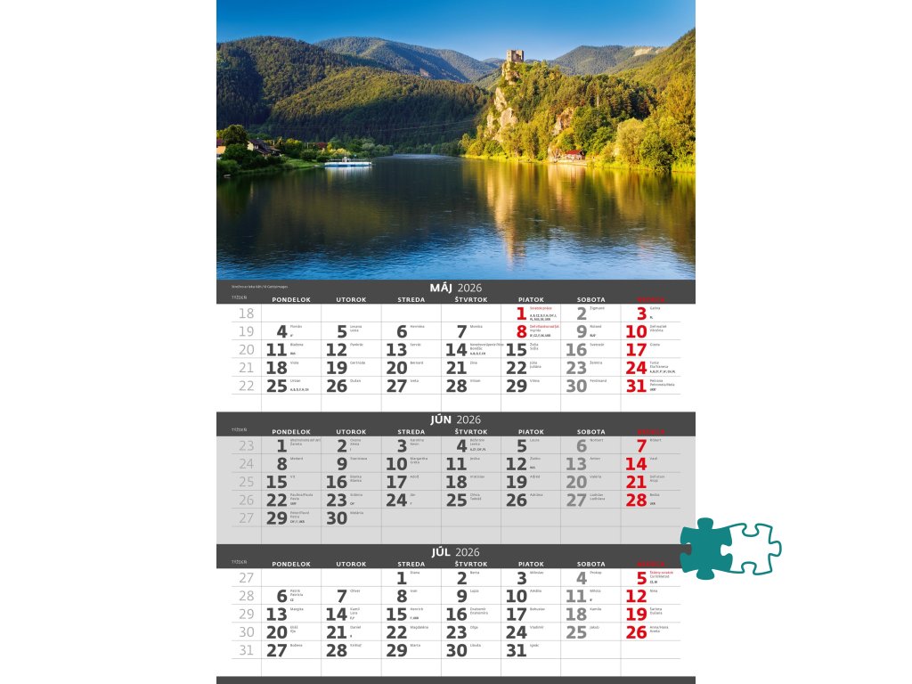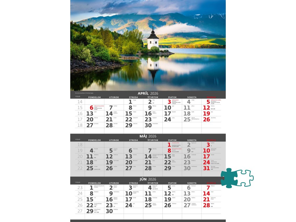 Formát kalendára: 31,5 x 45 cmKalendárium: slovenské trojmesačné so sviatkami európskych štátov (CZ / SK / A / B / D / F / H / CH / I / PL / RUS / UKR)