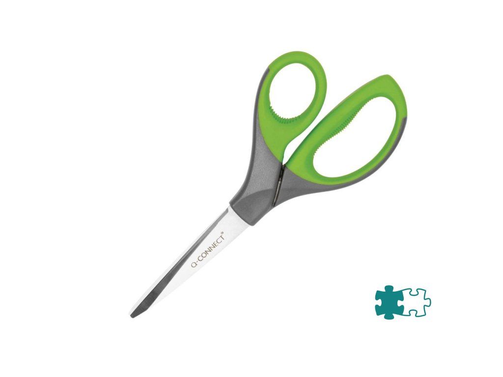 Kancelárske nožnice s ostrým hrotom na strihanie papiera, kartónu, lepenky, samolepiacej pásky a pod. s pogumovaným úchytom a strihacou časťou z nehrdzavejúcej ocele. Farba zelená/ sivá.Veľkosť: 21 cm.
