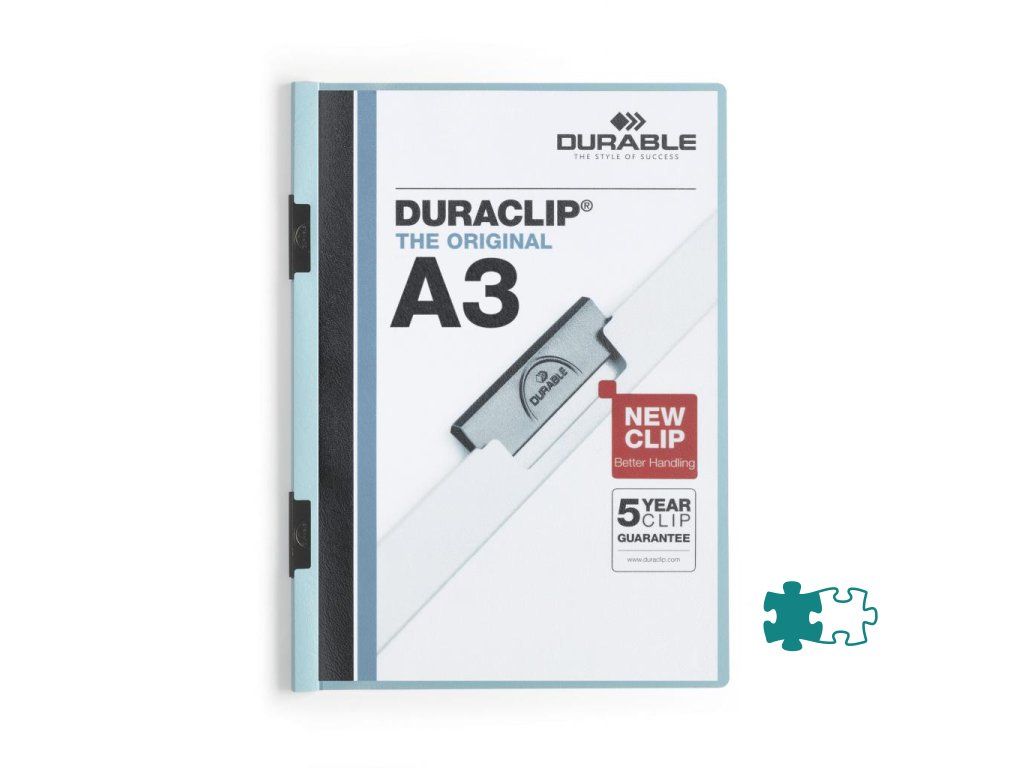 Obal vyvinutý spoločnosťou DURABLE pre viazanie nedierovaných listov. Materiál z PVC s unikátnym kovovým klipom, ktorý sa prispôsobí vloženému počtu listov a priehľadnou prednou stranou. Ideálny na prezentácie, ponuky, správy, poznámky na konferencie, semináre a pod. Formát A3 s dvomi klipmi. Kapacita 1-60 listov. Väčšie balenie 25 ks.Kapacita: 1-60 listov