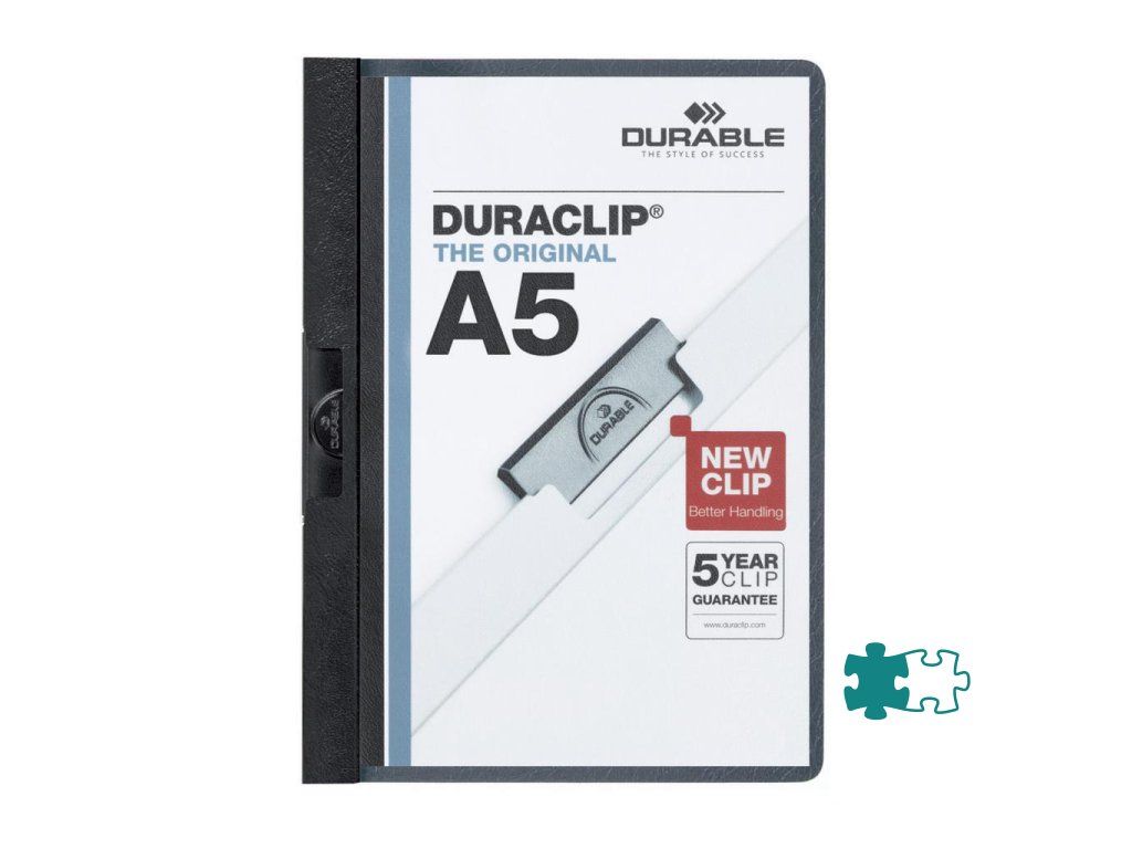 Obal vyvinutý spoločnosťou DURABLE pre viazanie nedierovaných listov. Materiál z PVC s unikátnym kovovým klipom, ktorý sa prispôsobí vloženému počtu listov a priehľadnou prednou stranou. Ideálny pre prezentácie, ponuky, správy, poznámky pre konferencie, semináre a pod. Formát A5. Kapacita 1-30 listov. Balenie 25 ks.Farba: čierna